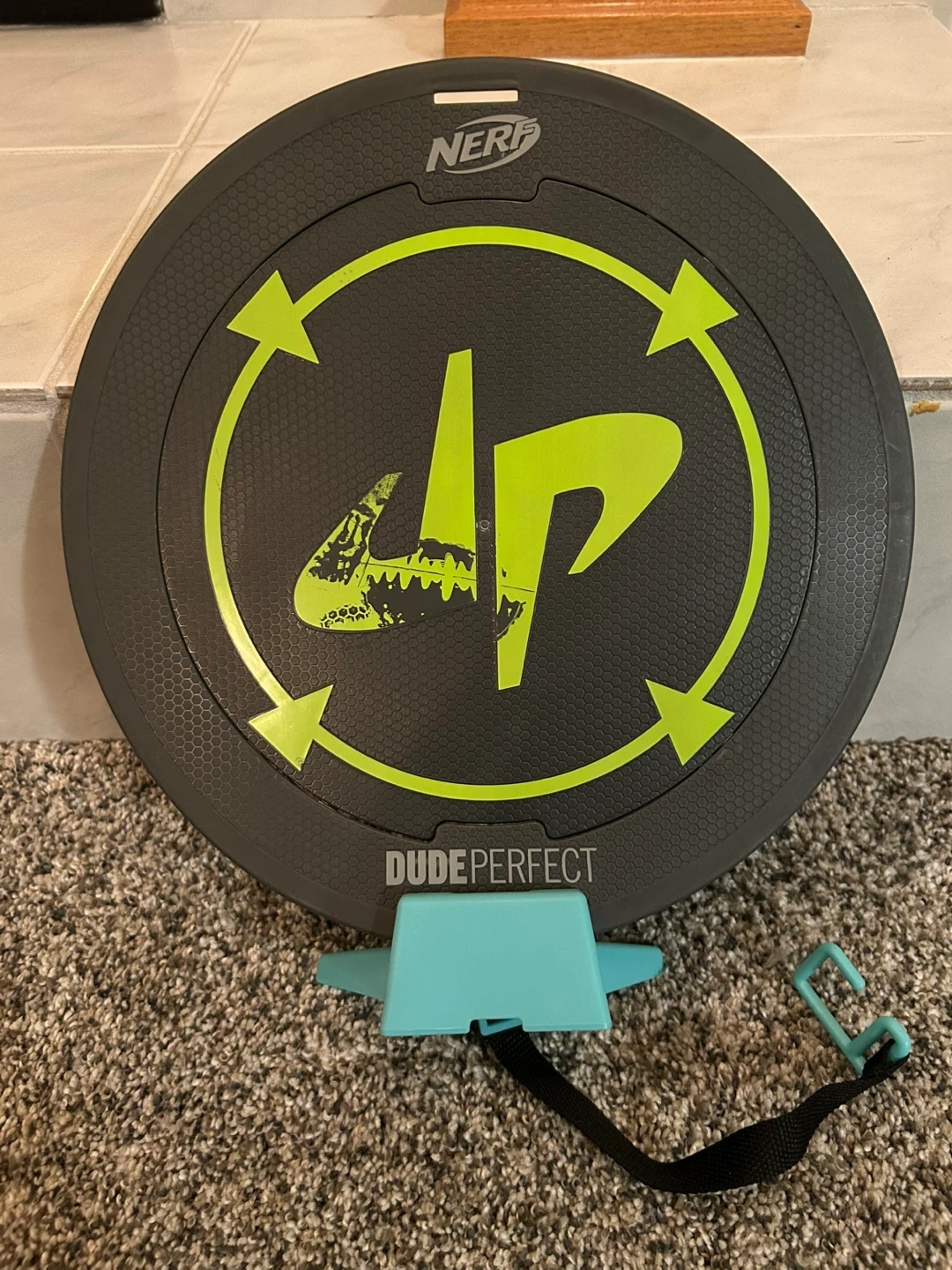Selling a Nerf Dude Perfect set that includes a target with removable piece that comes out when hit. Target is able to be placed and hung with the attached hook.