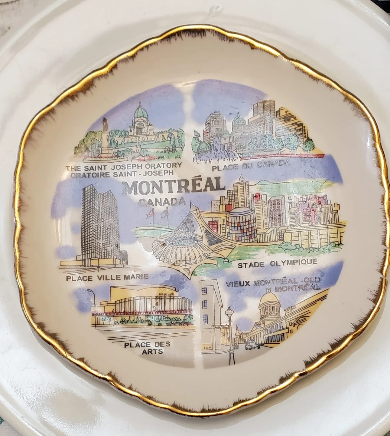 Selling a cute souvenir plate featuring Montreal, Canada! It showcases landmarks like the Saint Joseph Oratory, Place du Canada, Place Ville Marie, Place des Arts, the Olympic Stadium, and Old Montreal. Perfect for adding a touch of Montreal to your space