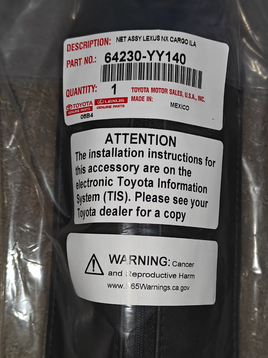 I am selling an OEM Lexus Toyota Net Assembly Lexus for a 2024 NX350 Trunk Elastic Mesh Cargo Net ILA in new condition. Never opened.
