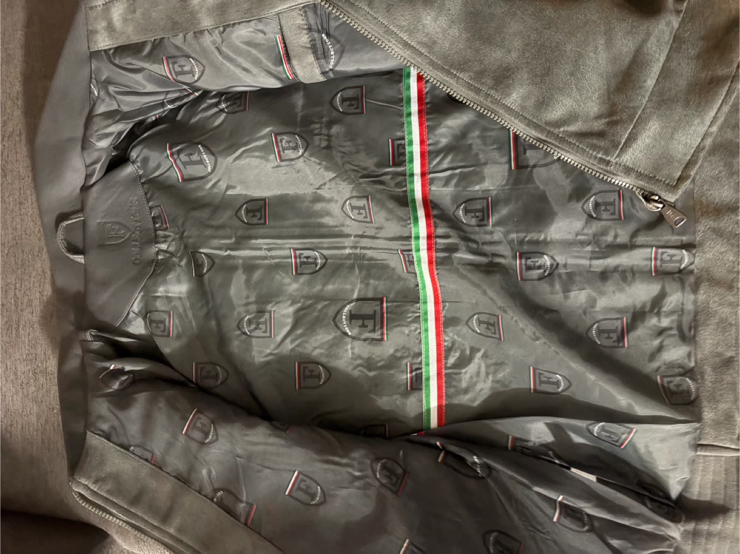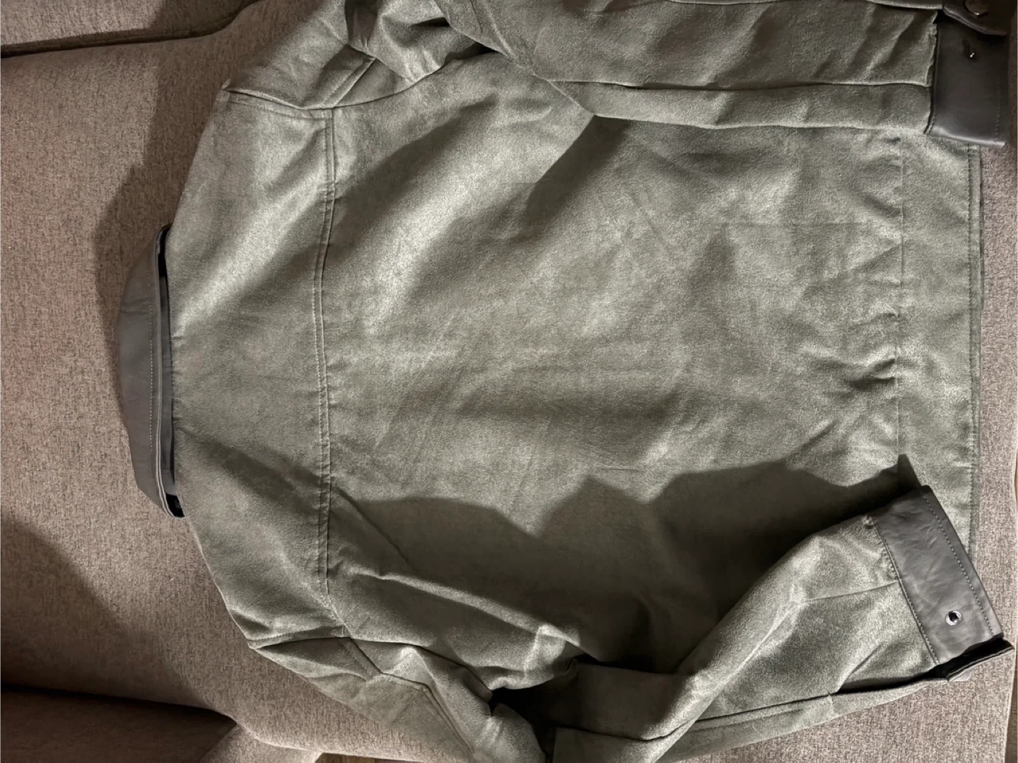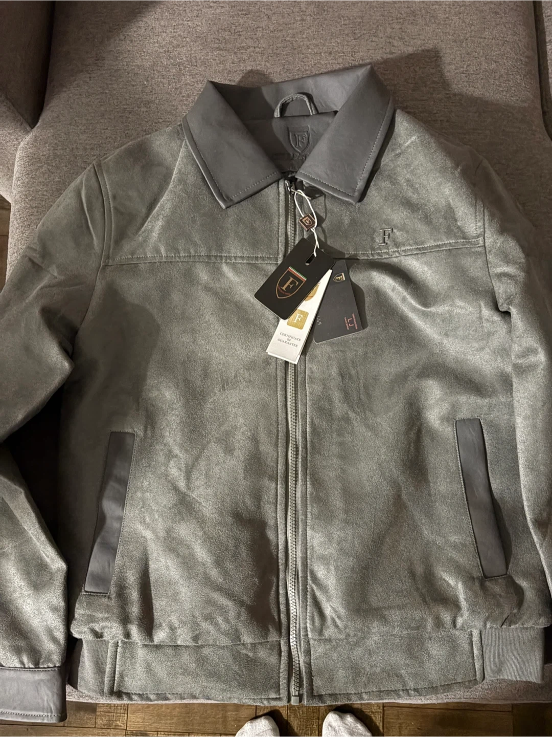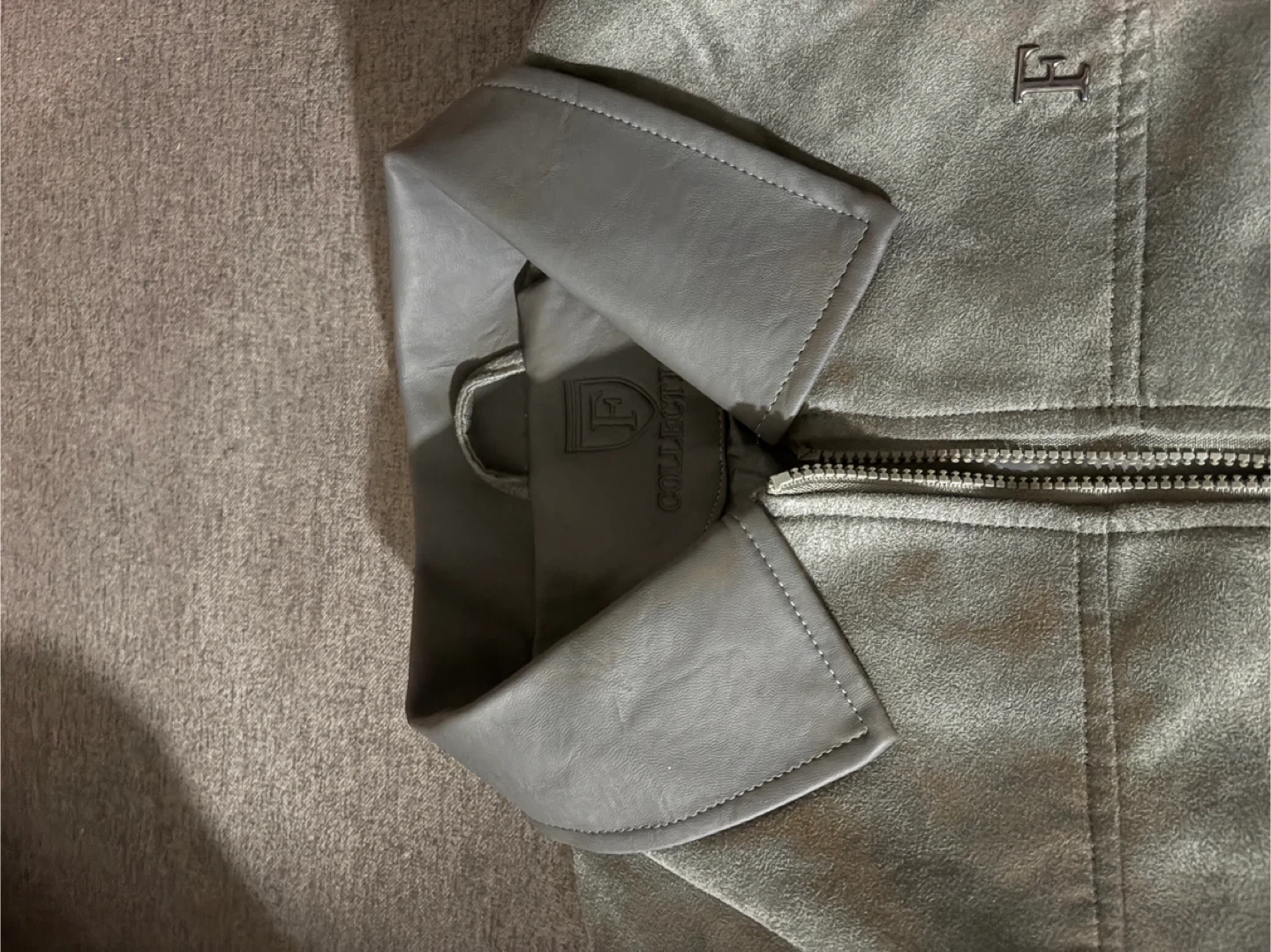 Selling a bomber jacket in a stylish grey colour. The jacket features a unique design with the brand's logo subtly incorporated into the lining. It's perfect for adding a touch of sophistication to any outfit