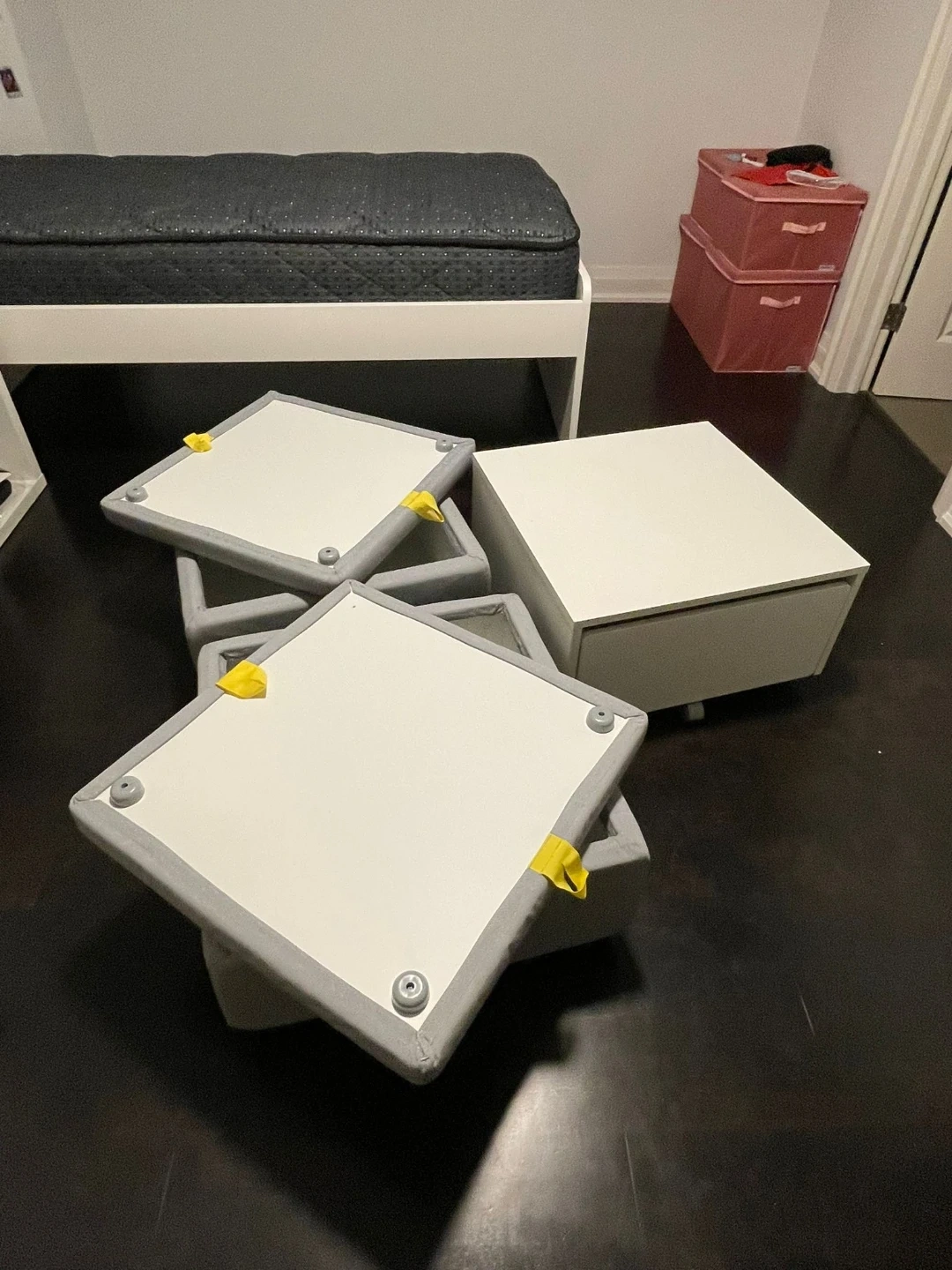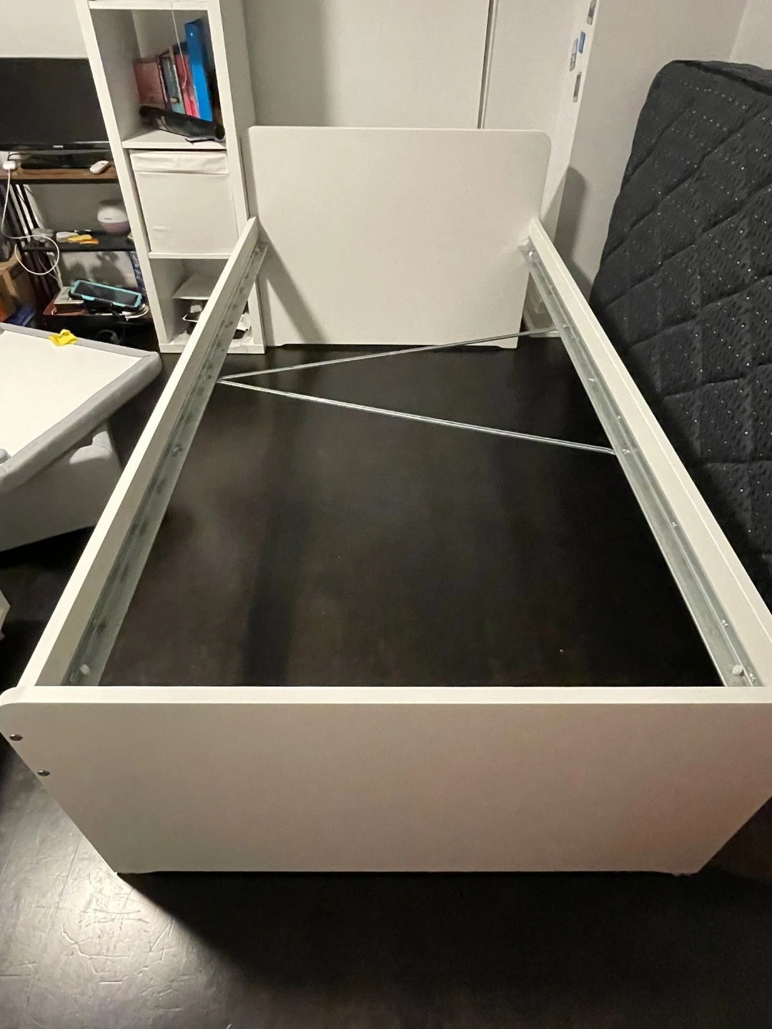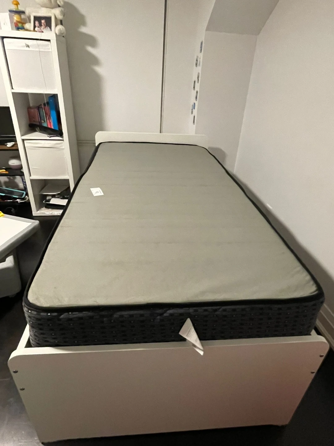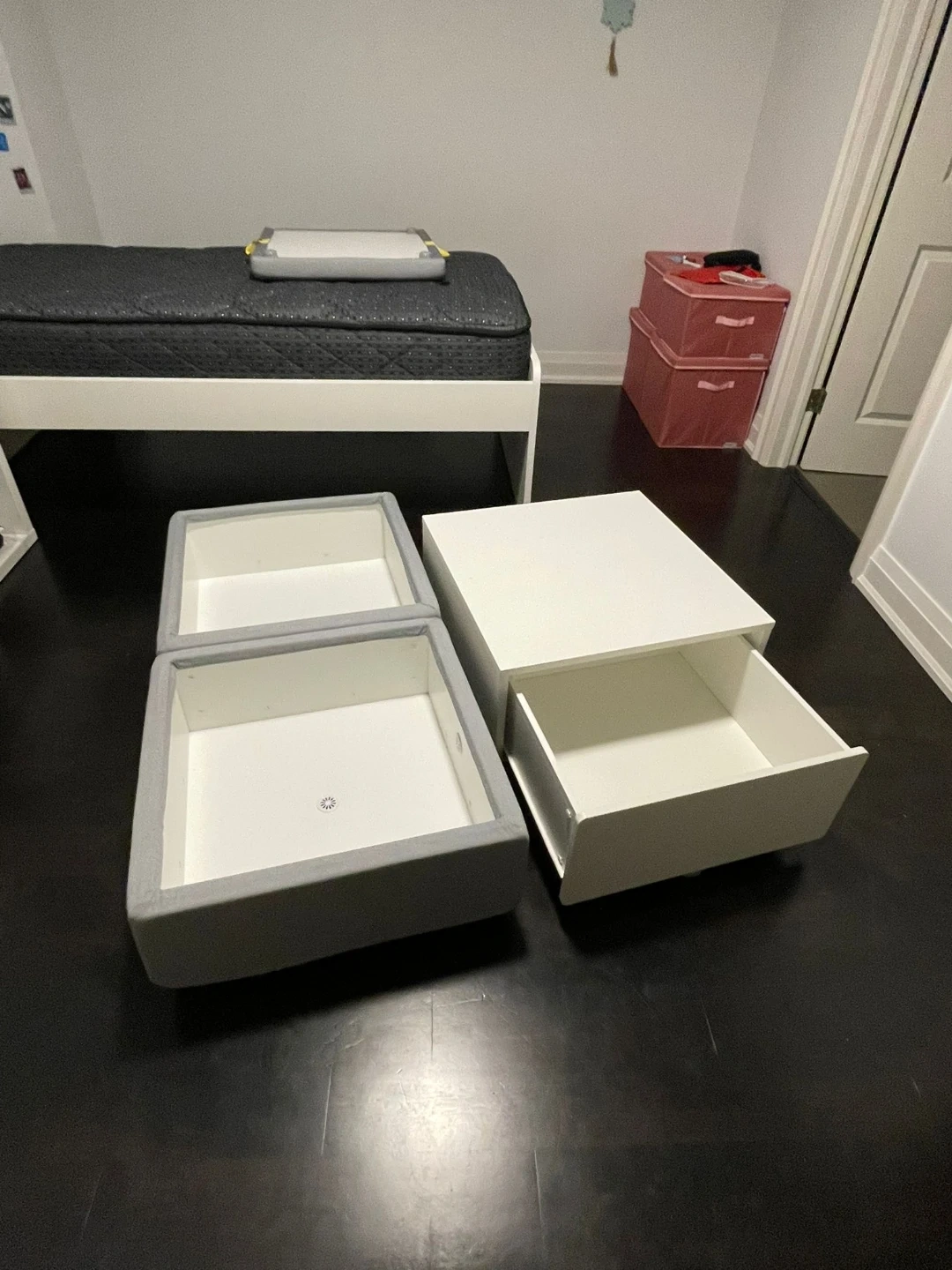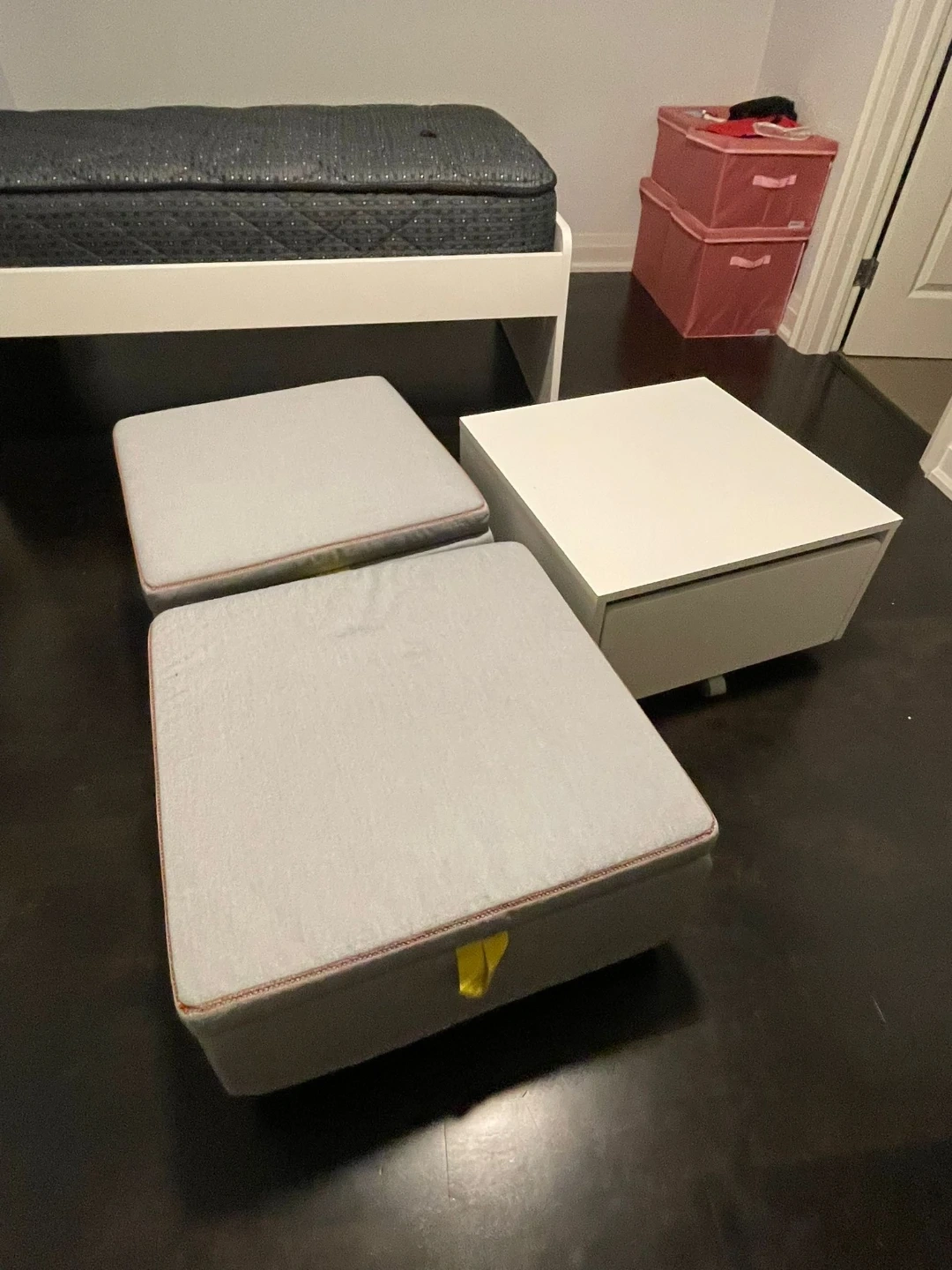 Also includes mattress, two storage seat sections and one storage box, all with casters.