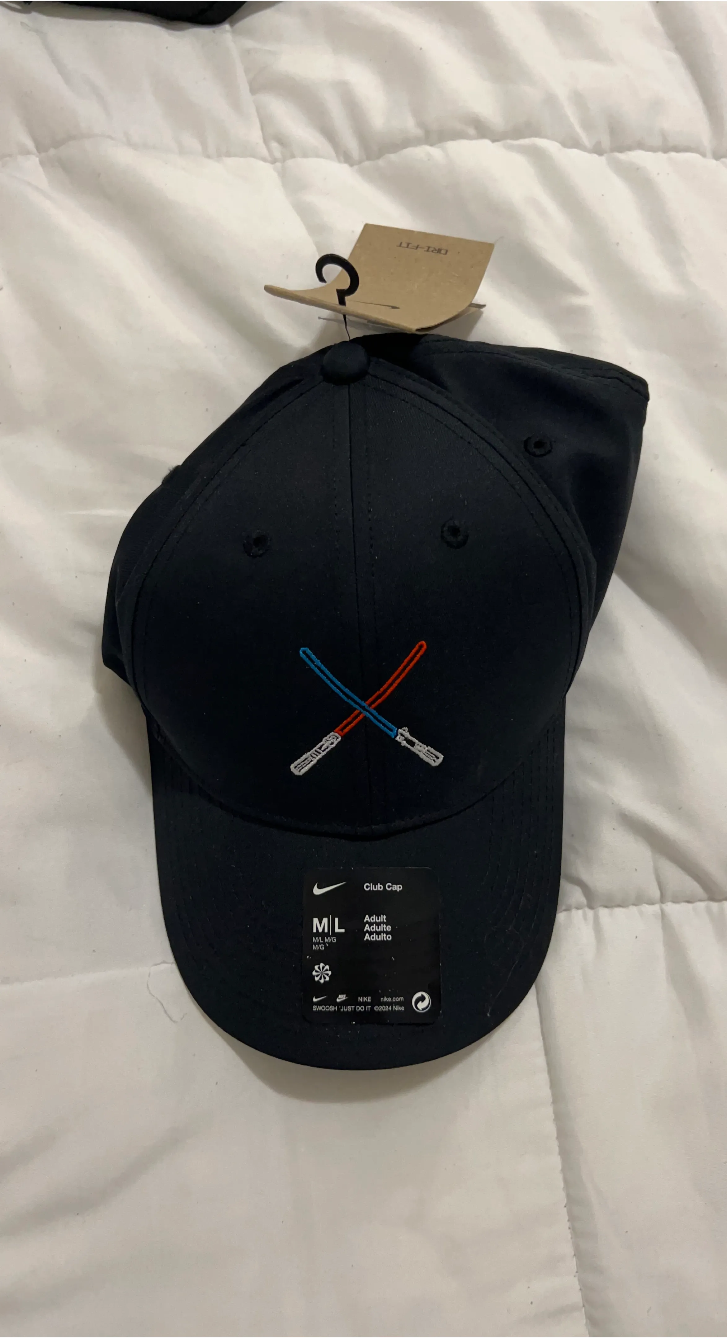 Nike Club Cap in size adult M/L. The cap is black and features a design with crossed lightsabers. It also has the Nike swoosh logo embroidered on the front.