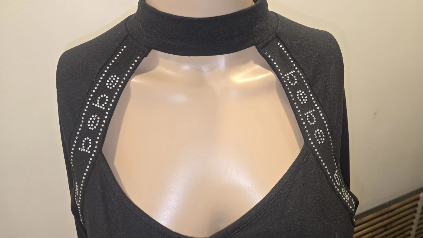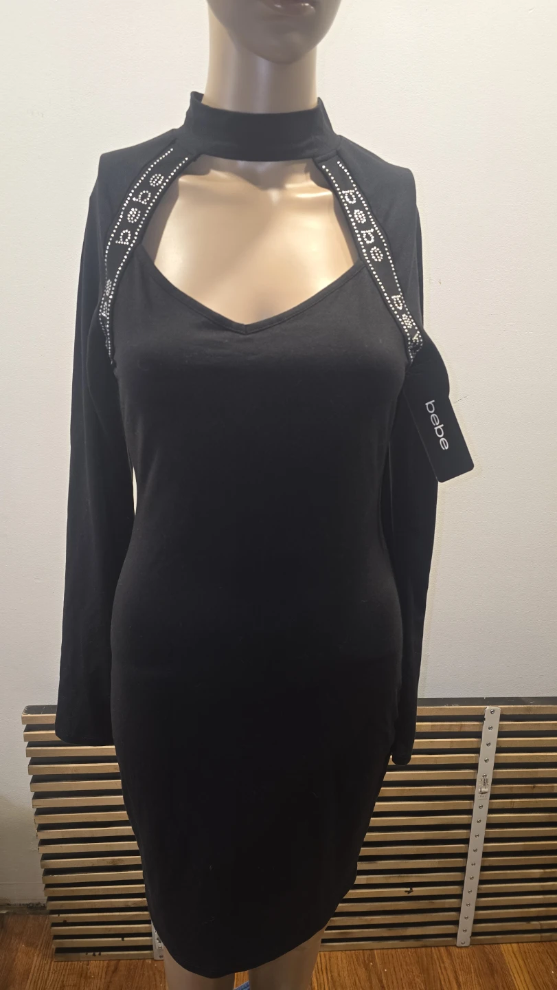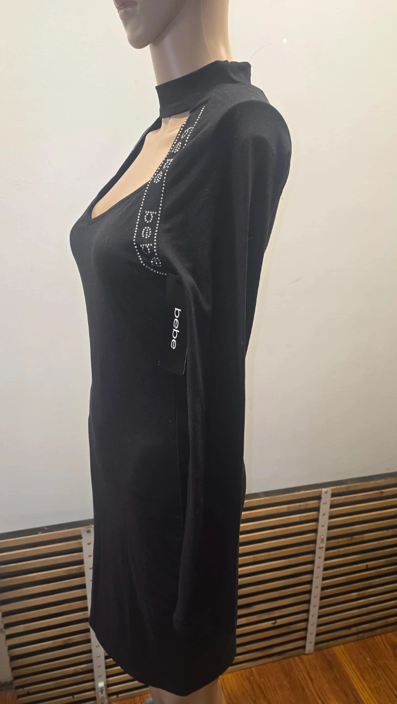 Bebe rhinestone cut-out black long-sleeve stretch dress to hug all those curves in size small! It features a unique neckline with the Bebe logo in rhinestones Perfect for a night out or special occasion