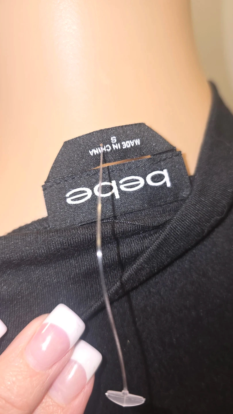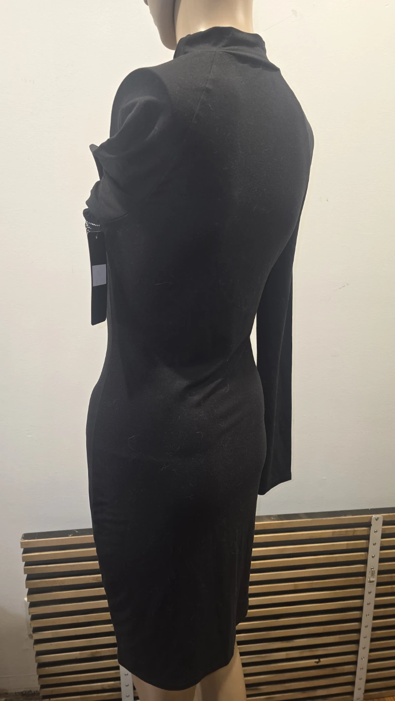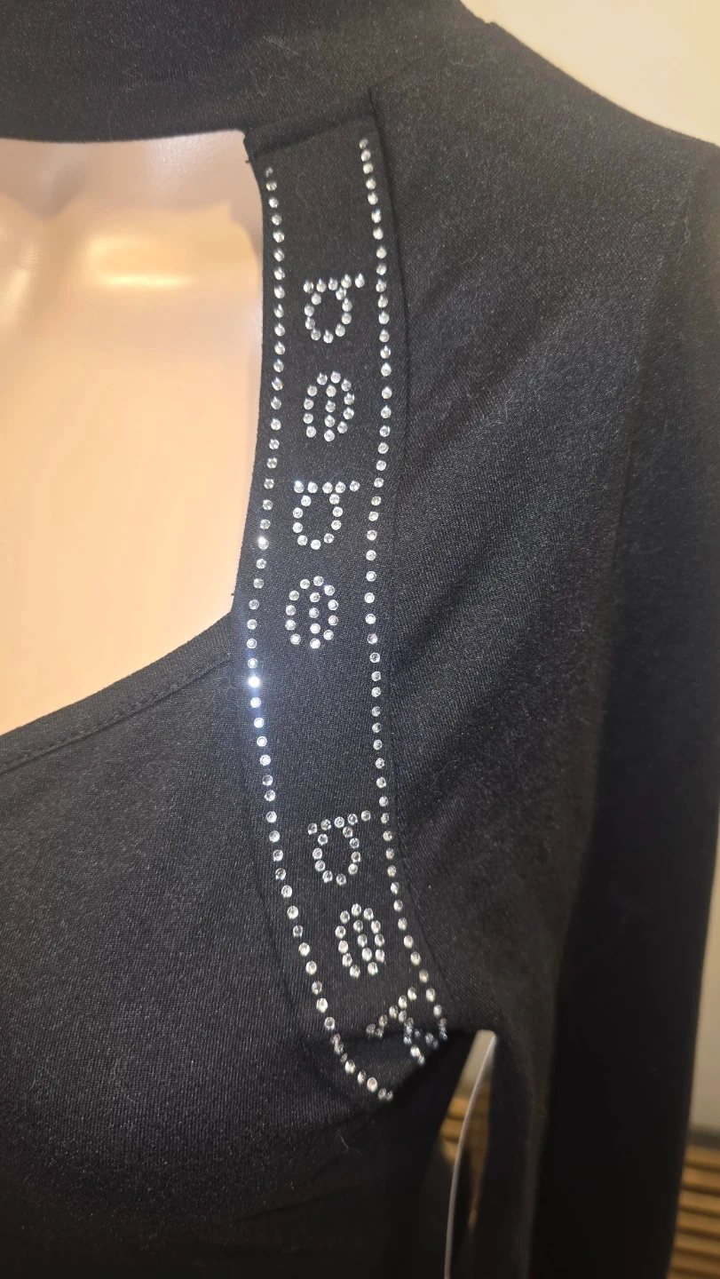 Bebe rhinestone cut-out black long-sleeve stretch dress to hug all those curves in size small! It features a unique neckline with the Bebe logo in rhinestones Perfect for a night out or special occasion