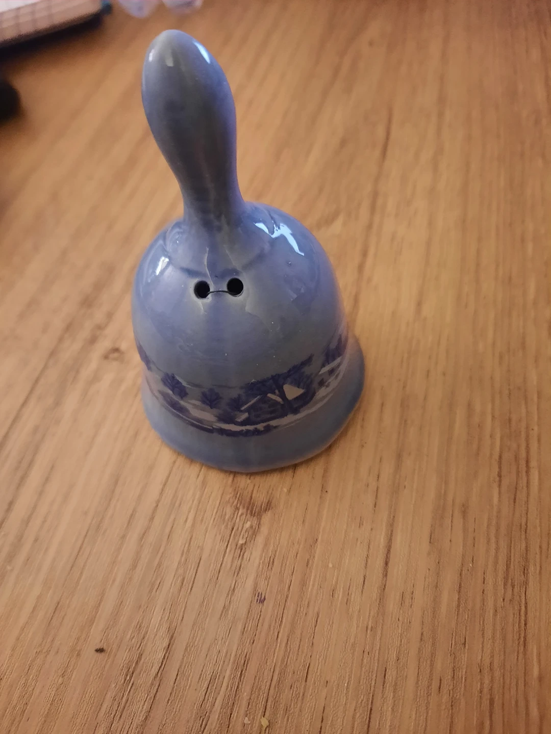 The two small holes visible near the top of the bell suggest it may also function The bell is made of porcelain and features a distinctive, glossy cobalt blue glaze.