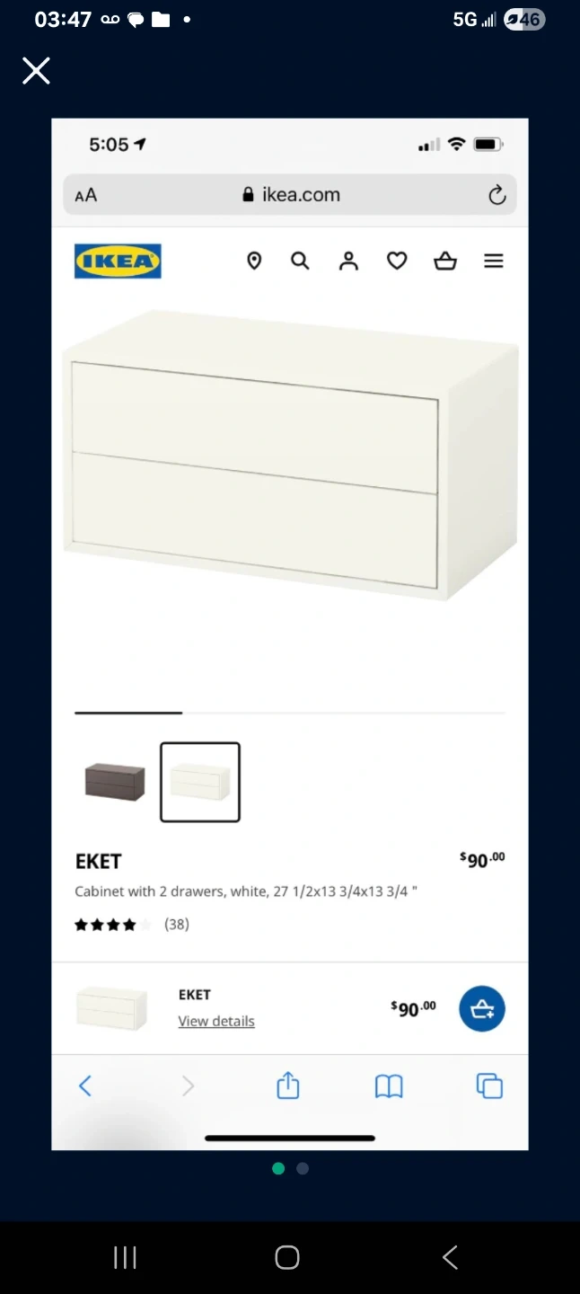 Selling two IKEA EKET cabinets, each with two drawers. They're in a gray color and measure 27 1/2x13 3/4x13 3/4". The screenshot shows they retail for $90 each!