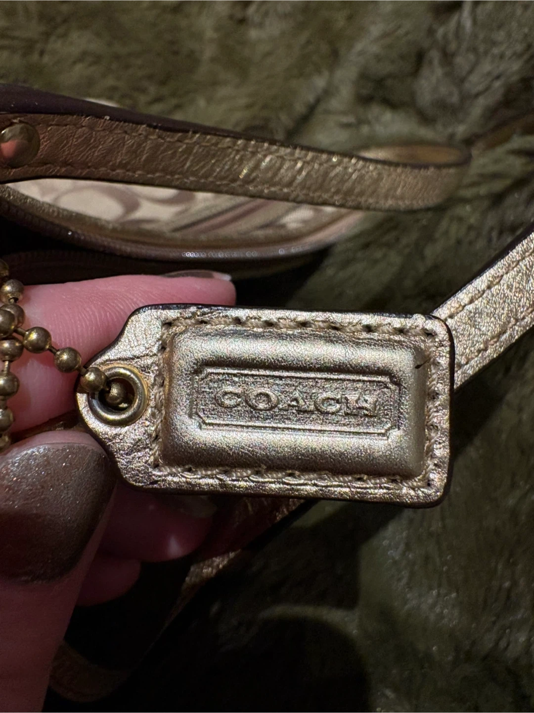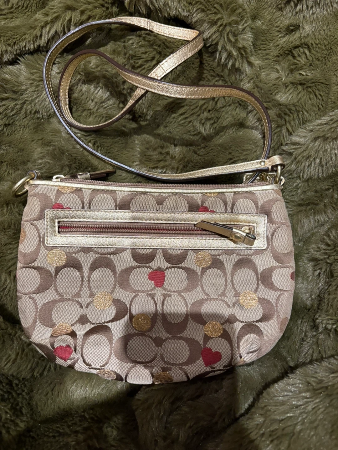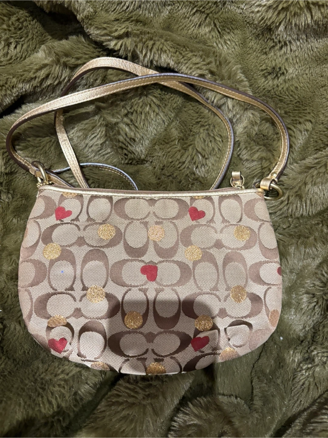 Cute Coach crossbody bag in good condition! It features the classic Coach logo pattern with hearts and gold accents. Perfect for everyday use!