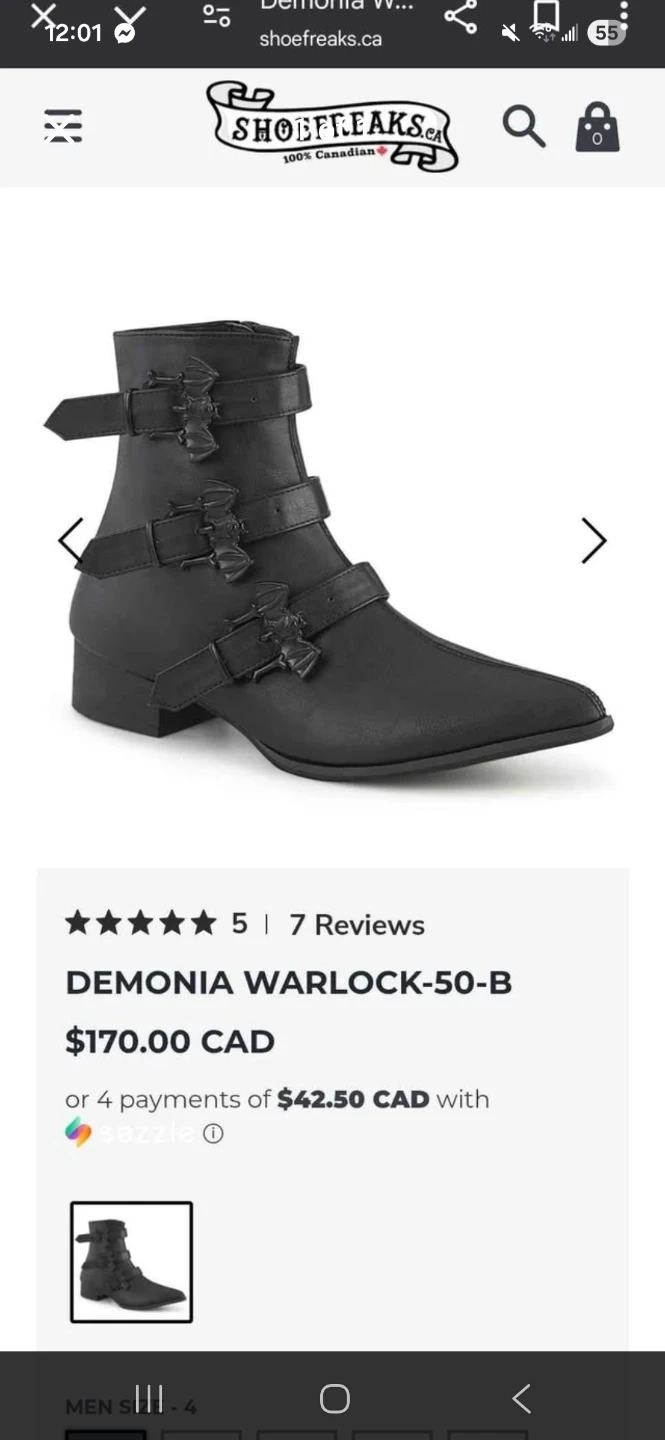 Selling a pair of Demonia Warlock-50-B boots in black! These retail for $170 CAD. They have a unique design with bat details on the straps. Perfect for adding a bit of edge to your look