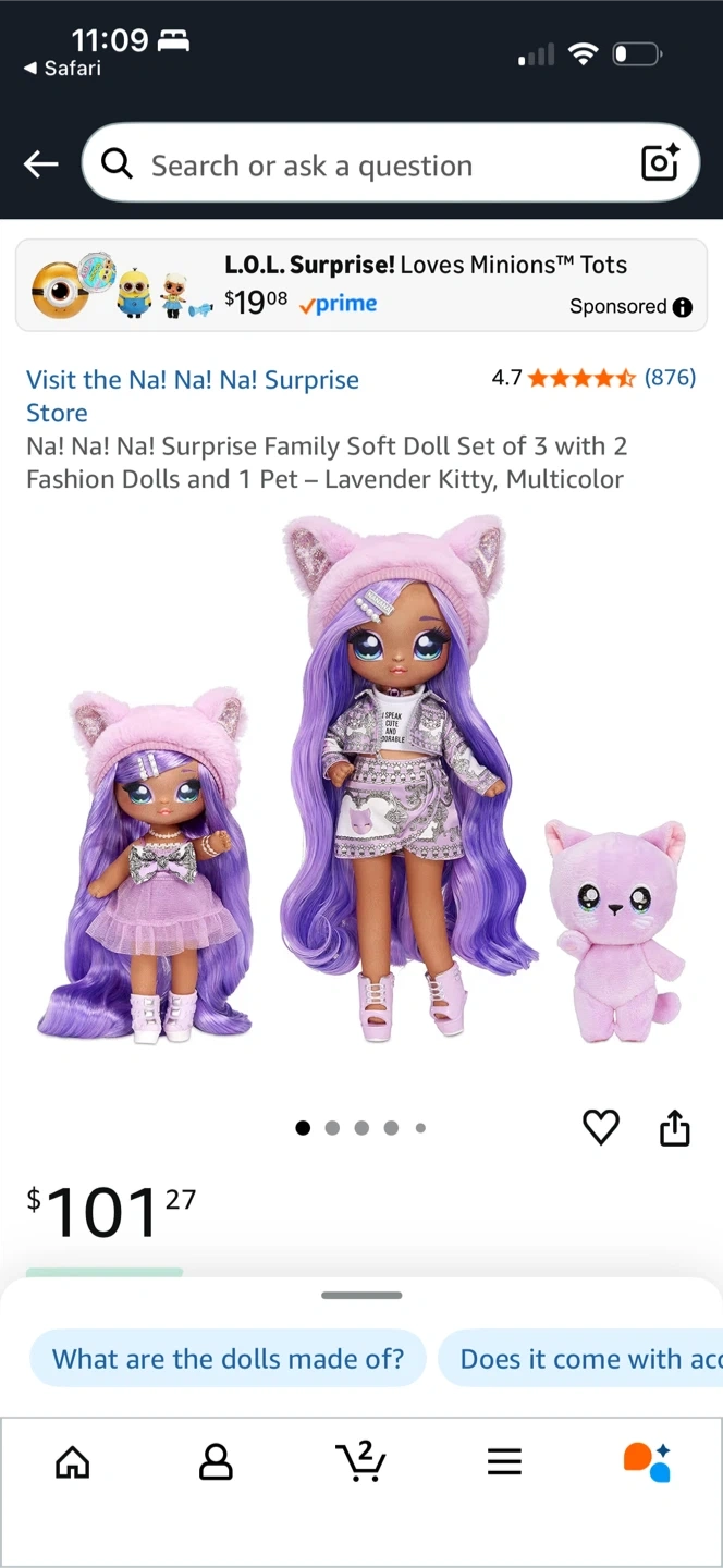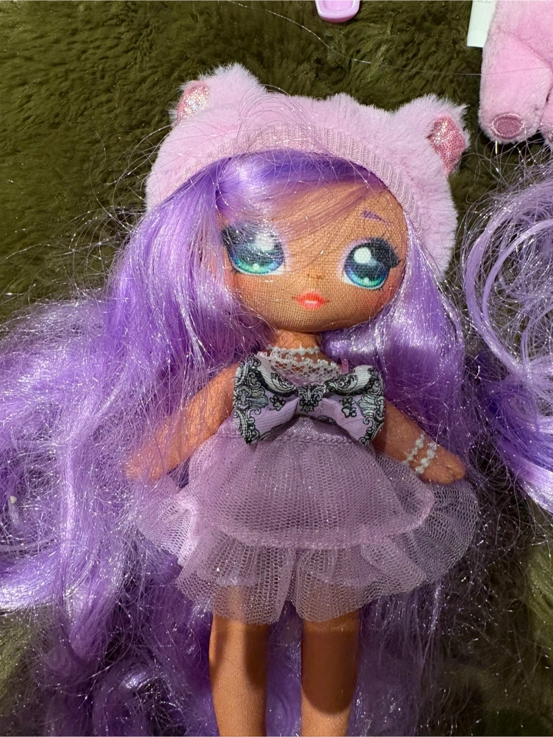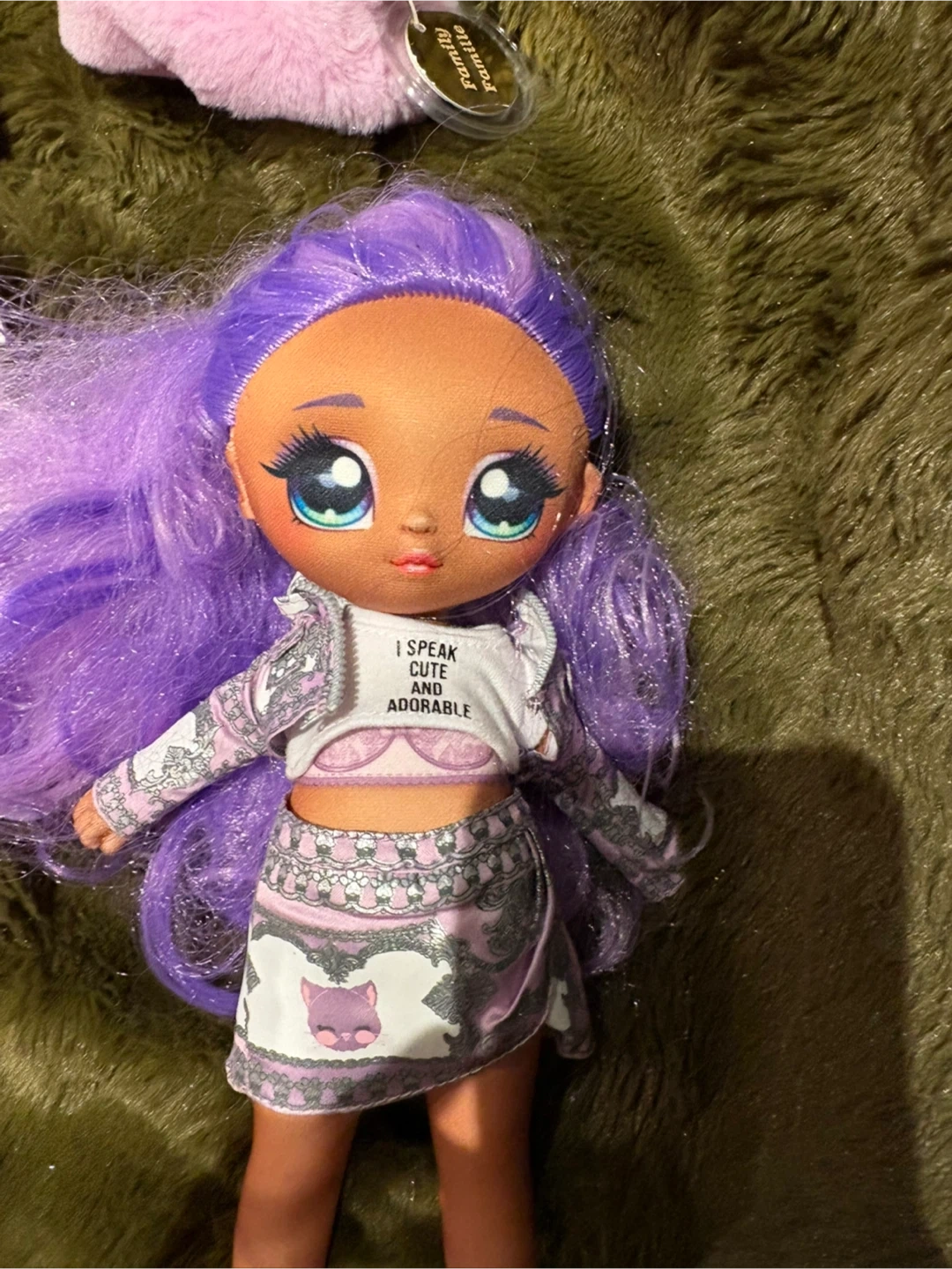 Selling a Na! Na! Na! Surprise Family Soft Doll Set. This set includes two fashion dolls and one pet. The dolls have beautiful purple hair and stylish outfits. The larger doll's shirt reads 'I SPEAK CUTE AND ADORABLE'. Missing one pair of boots for the smaller doll