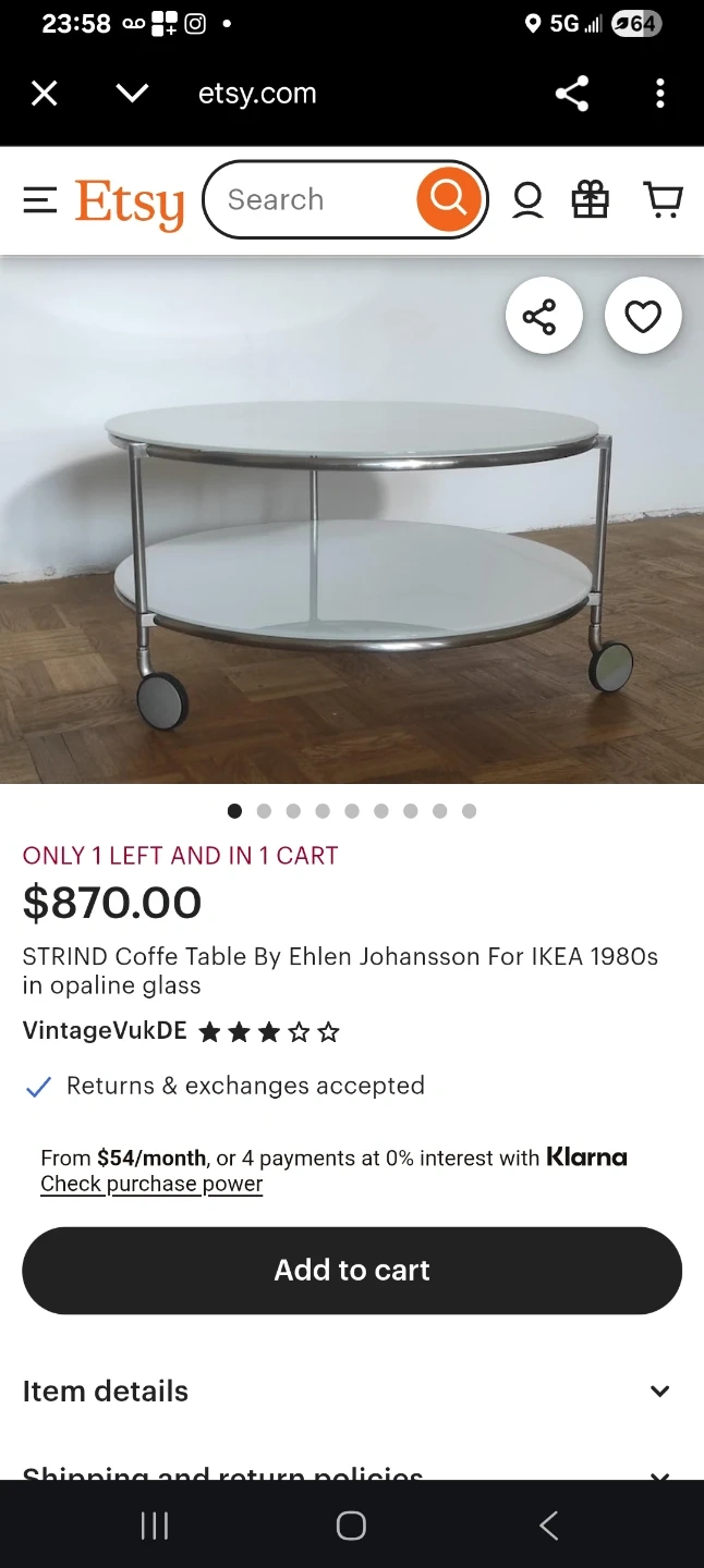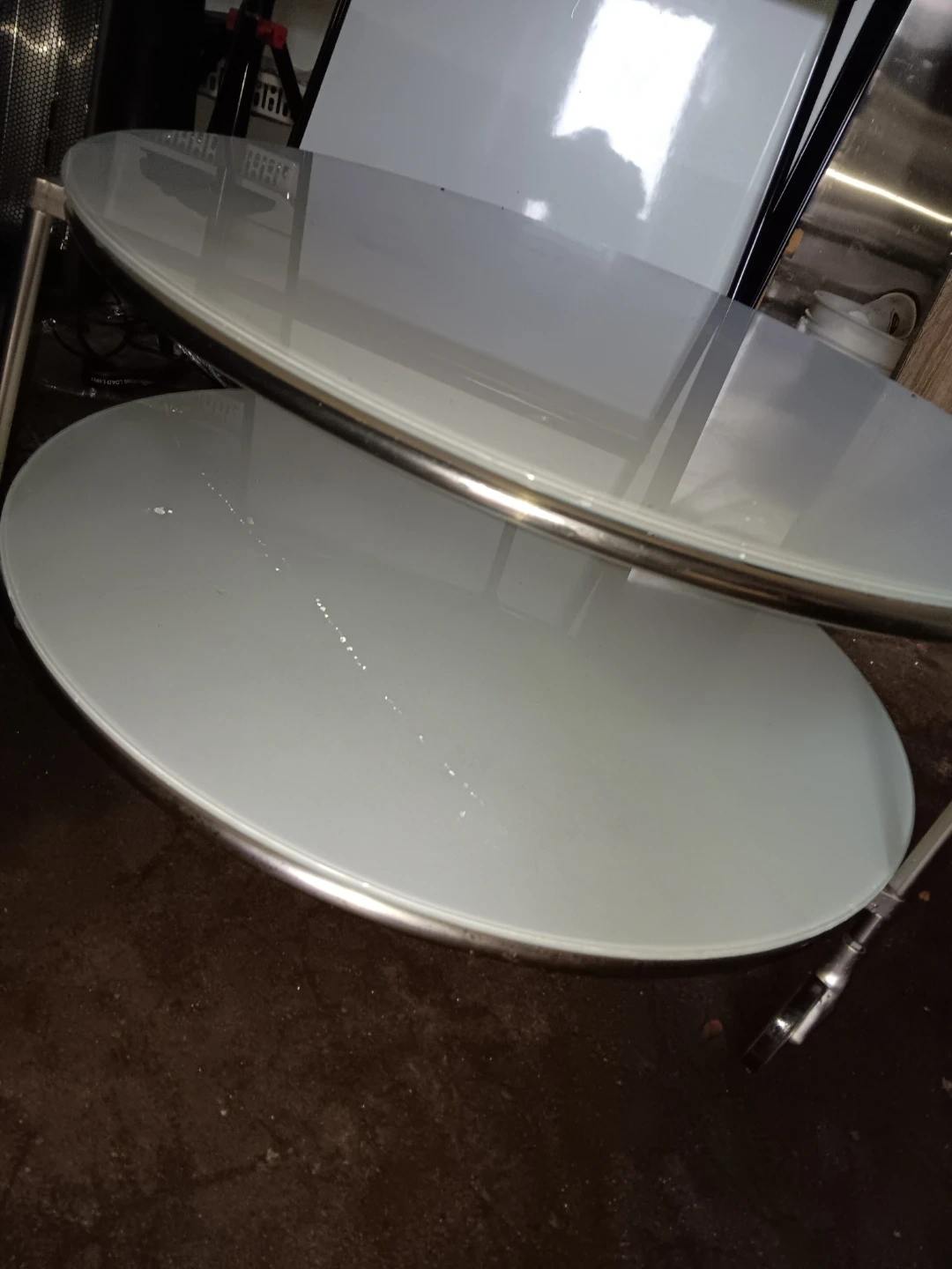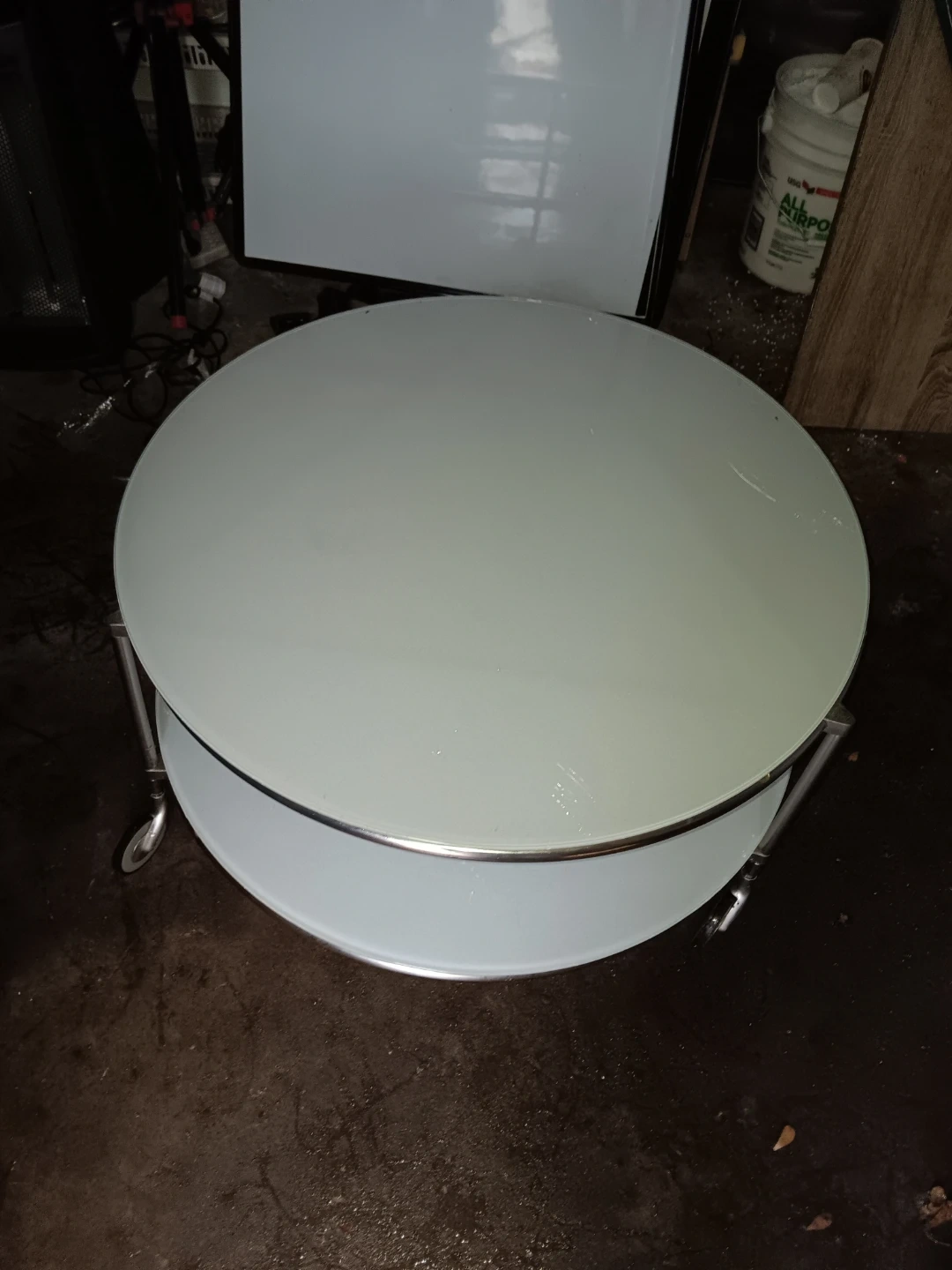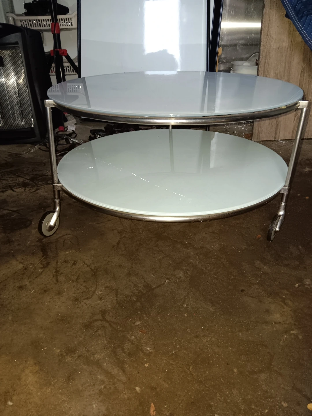 Selling a stylish IKEA STRIND coffee table. It features a sleek, round design with two glass shelves and chrome-plated legs with wheels. The table is in good condition and ready to add a touch of modern elegance to your living space