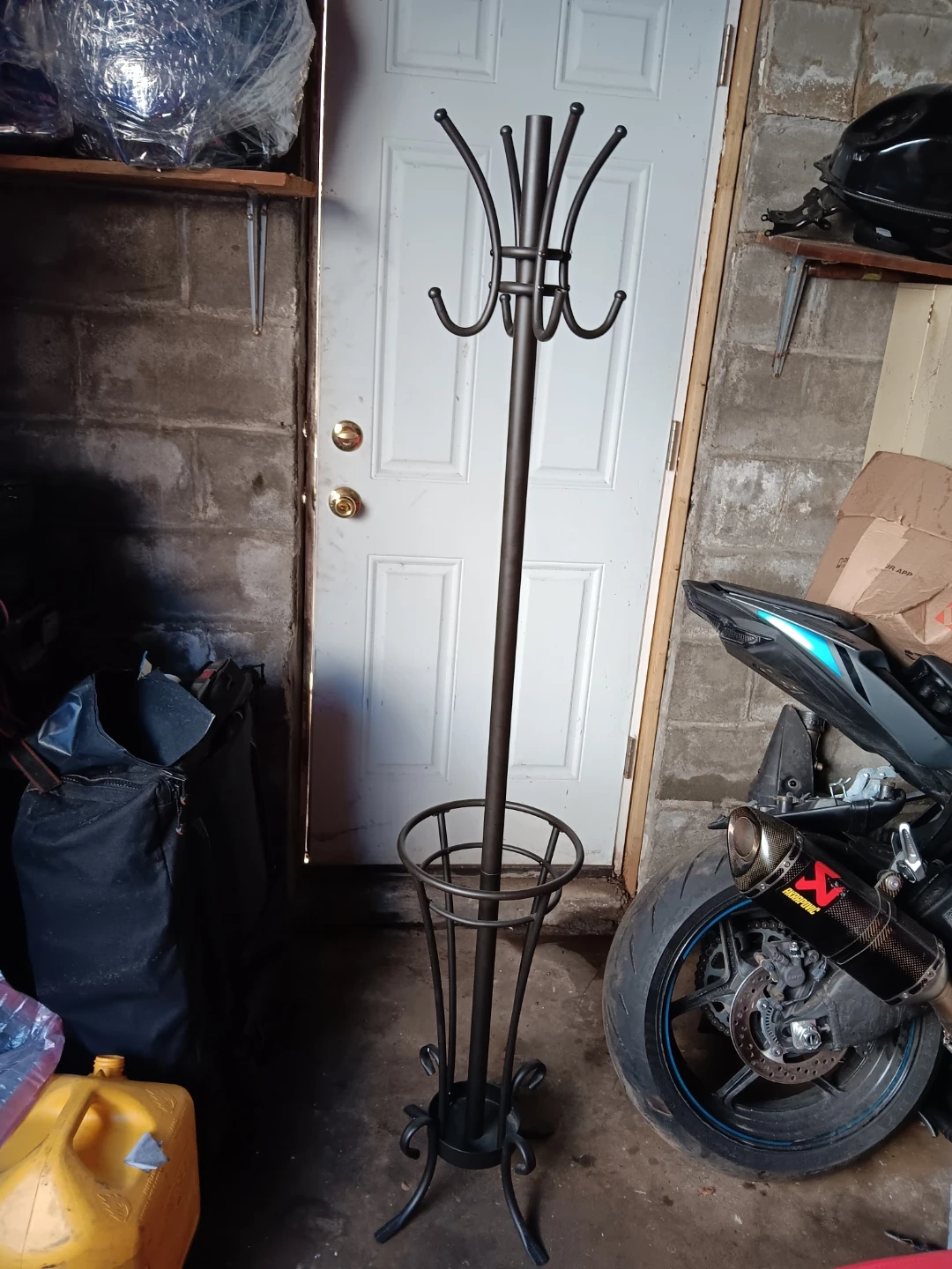 Selling a coat rack with an umbrella stand. It's in good condition and ready to use! It has multiple hooks for coats and a stand for umbrellas at the bottom. Perfect for entryways or hallways to keep things organized