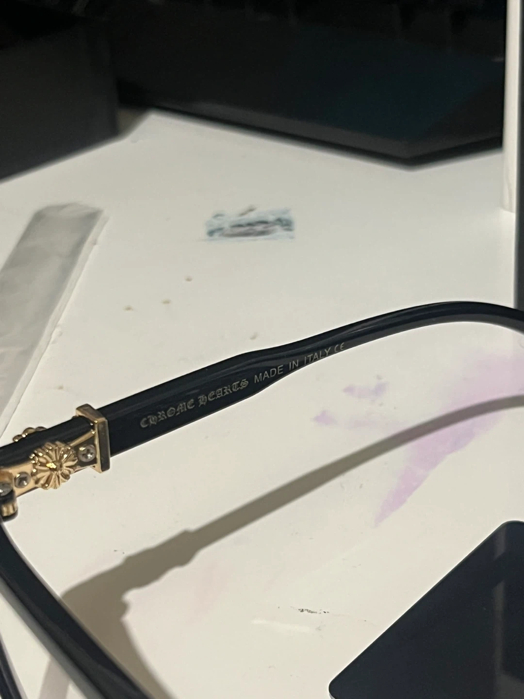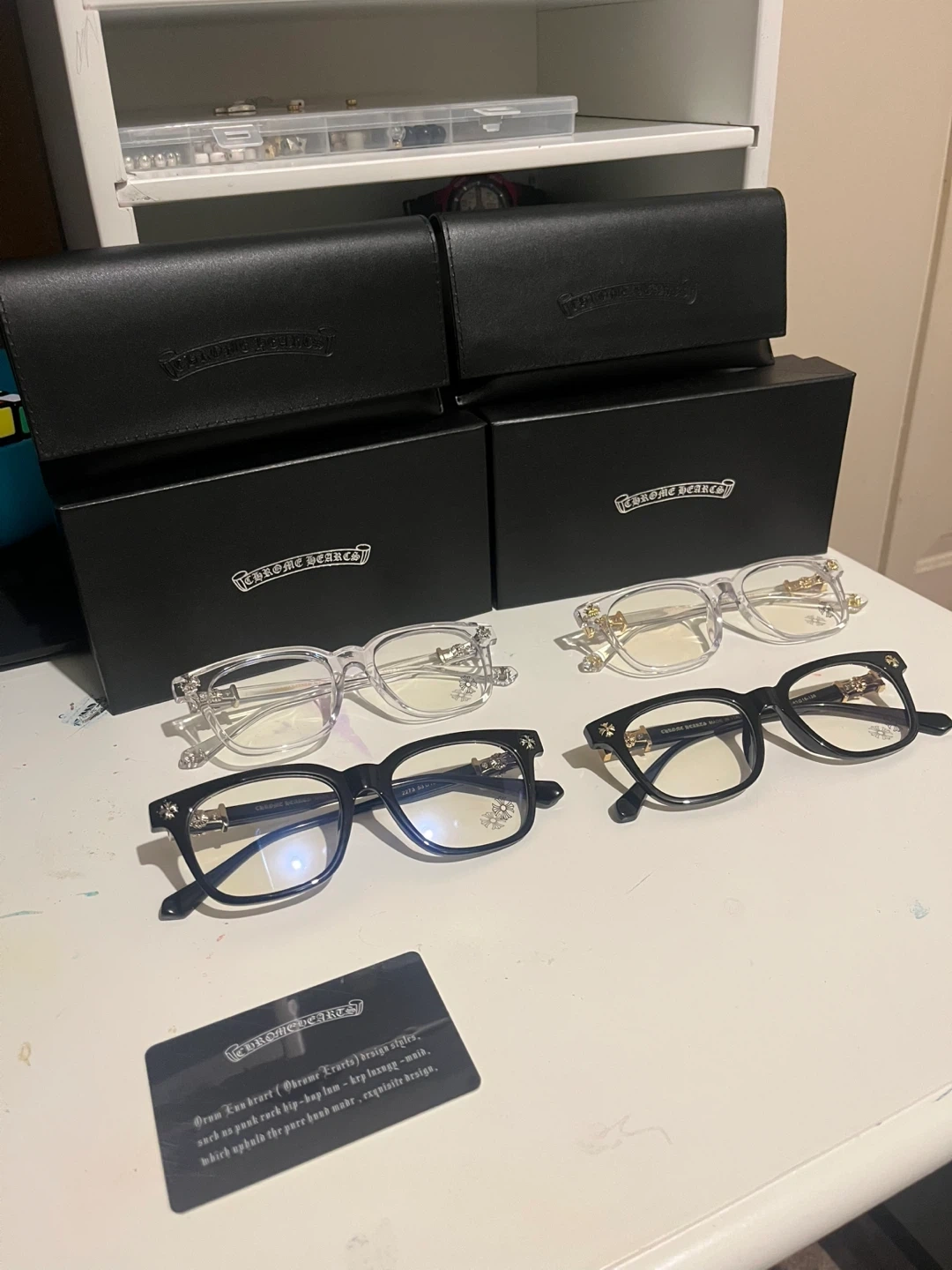 Selling a pair of Chrome Hearts eyeglasses in black gold and silver and clear sliver and gold . The eyeglasses are made in Italy.