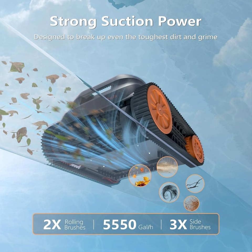 This cordless pool vacuum cleaner features three upgraded brushless motors and delivers 5500 GPH suction power, efficiently removing sand, dust, and fine particles. With dual PVC brushes and large suction ports, this pool robot vacuum removes dirt, leaves, and debris with ease.