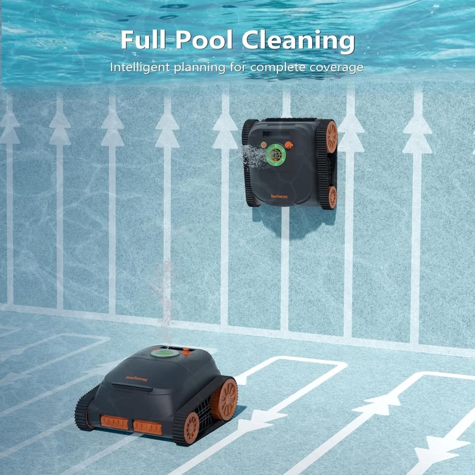 The advanced navigation system maps your pool for complete coverage. Choose from 4 cleaning modes (Auto, Wall Only, Floor Only, Classic) to match your pool’s needs. Equipped with a 5200mAh rechargeable battery, this battery powered pool vacuum cleaner runs up to 210 minutes and covers pools up to 3,229 sq.ft in one cycle.