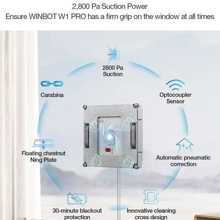 This robot attaches with 2,800Pa suction, freeing you from window cleaning. Its cross spray technology keeps the mopping humid, dissolving stains. The internal drive system ensures steady movement and protects against power failure. It cleans windows with forward-reverse motion in 3 modes: quick, deep, and spot cleaning. It detects edges in 0.02 seconds, even on frameless glass. The 60ml reservoir saves you from frequent refills. Control cleaning modes and get notifications via the app. It returns to its starting point after cleaning.