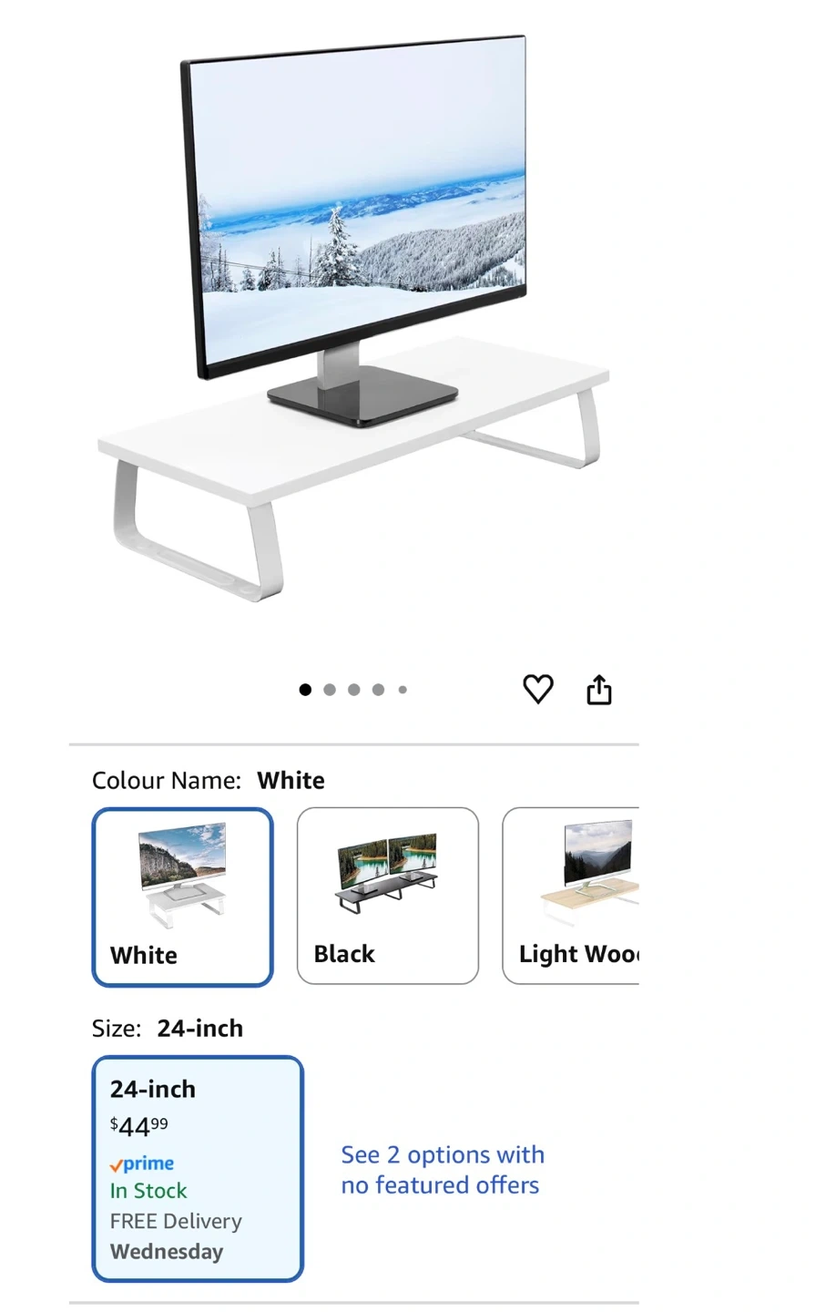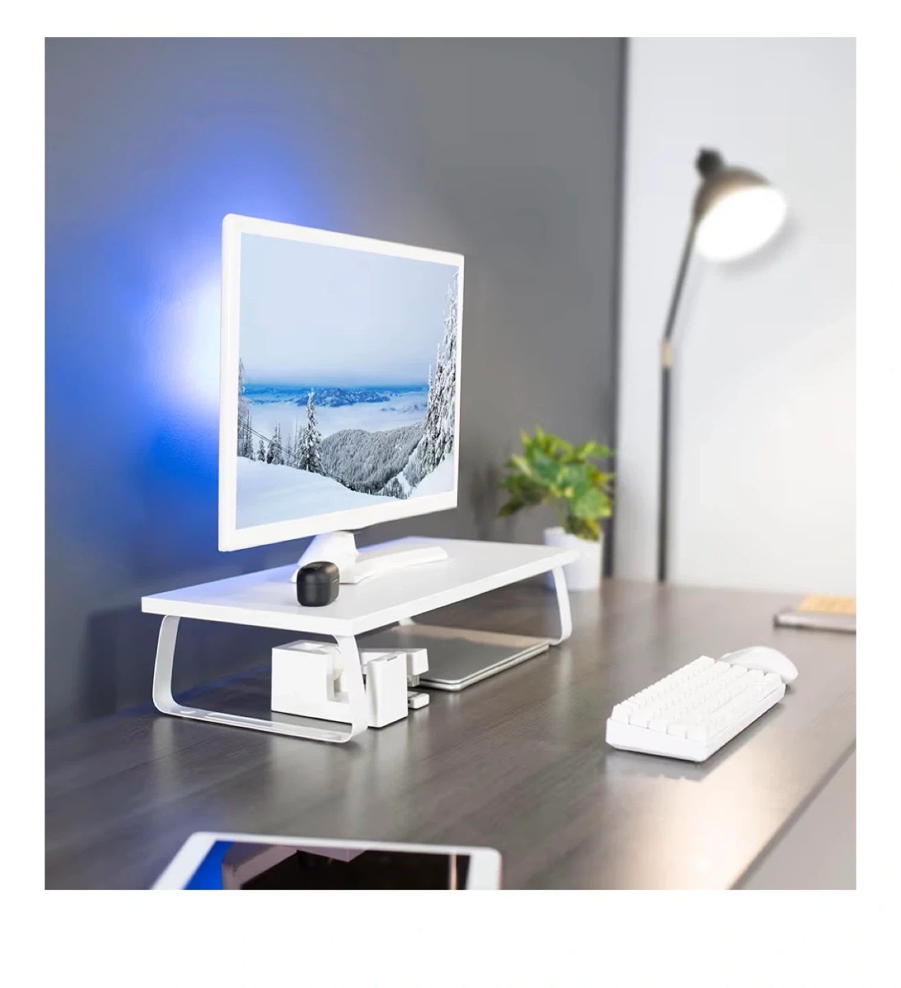 Selling a white monitor riser, perfect for decluttering your workspace! It's 24 inches wide, providing ample space for your monitor and accessories. The steel footing ensures solid support, and the anti-slip padding grips surfaces to prevent scratches. It can hold up to 44 lbs