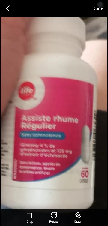 Selling a bottle of Life Brand Assisté Rhume Régulier capsules.