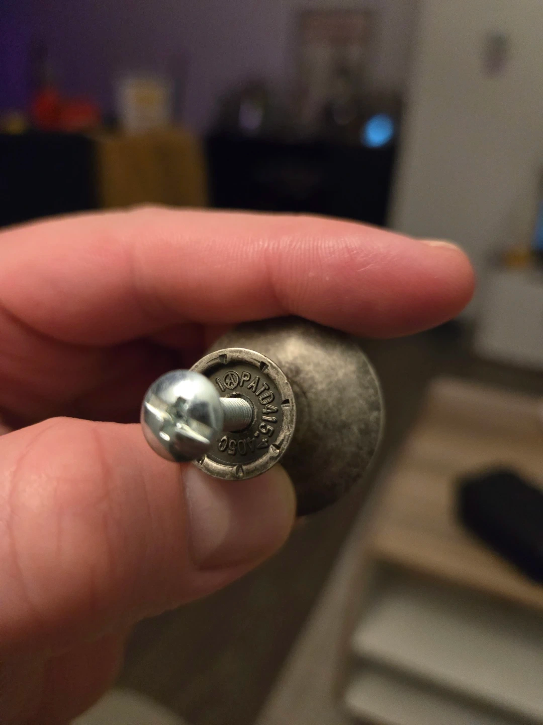 Here's a lovely vintage-style cabinet knob! It features a decorative design on the front and comes with its screw for easy installation. Perfect for adding a touch of antique charm to your furniture or cabinets. I have a dozen of them.