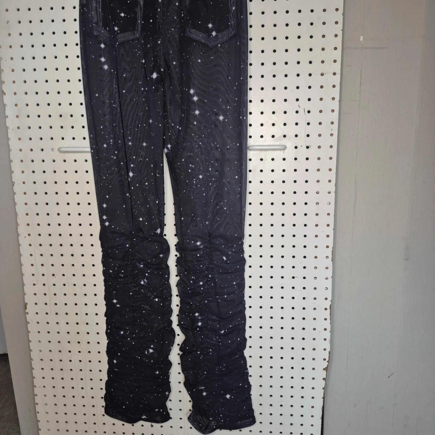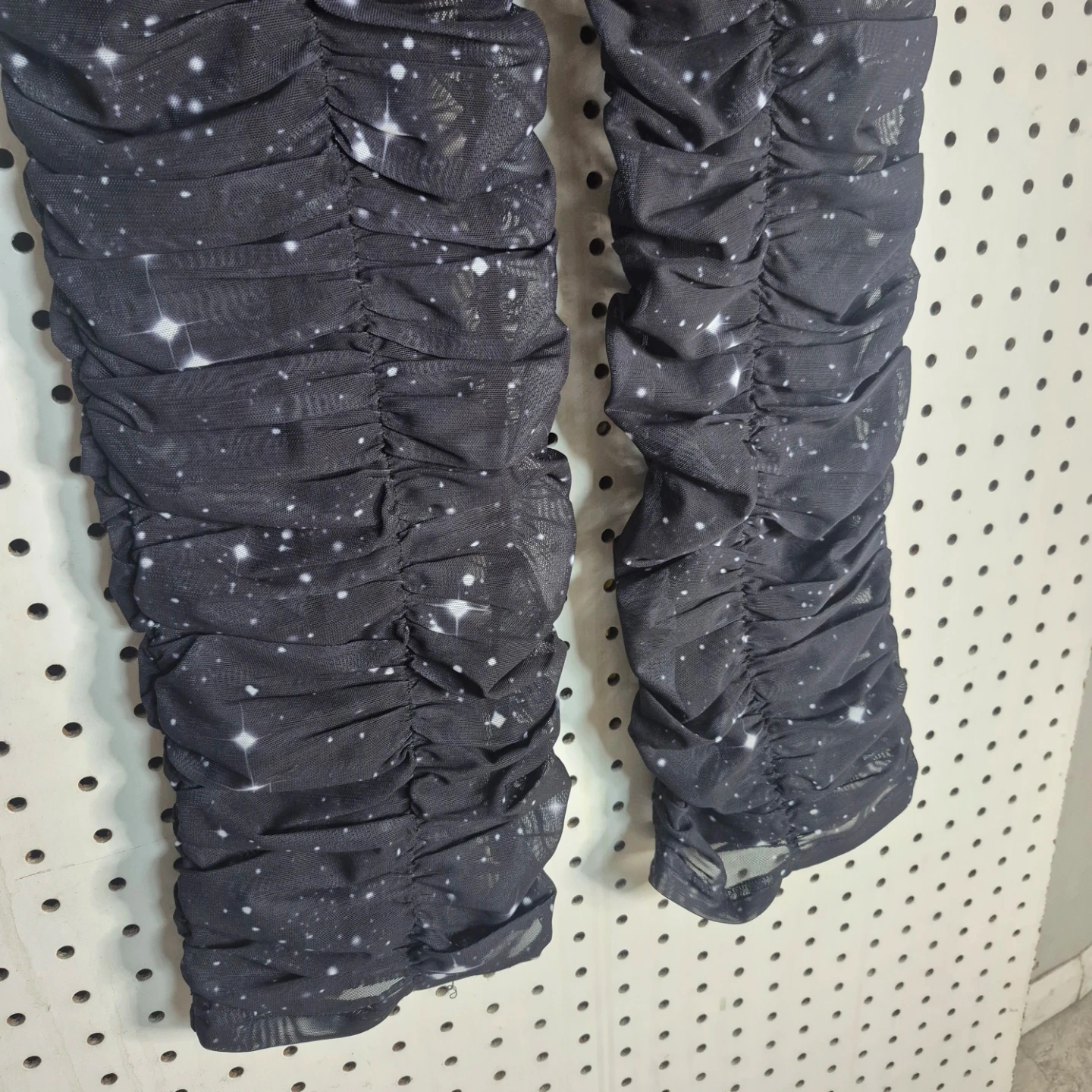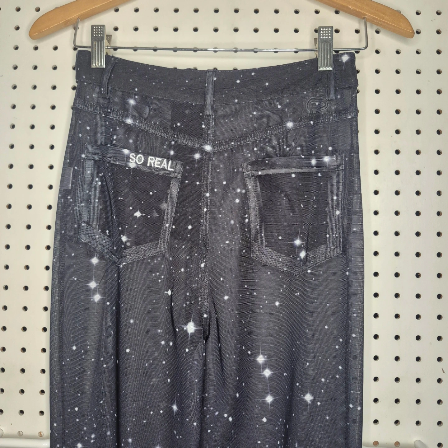 These SO REAL pants feature a unique starry night design and ruched detailing at the bottom! They're perfect for adding a touch of whimsy to your wardrobe. The material is comfortable and stylish, great for everyday wear!