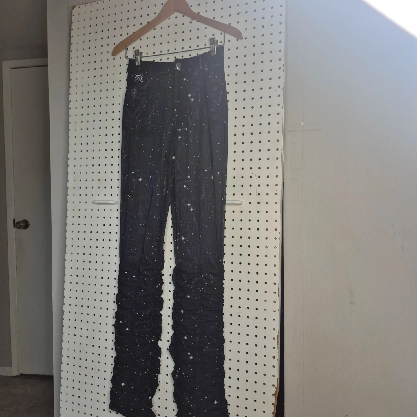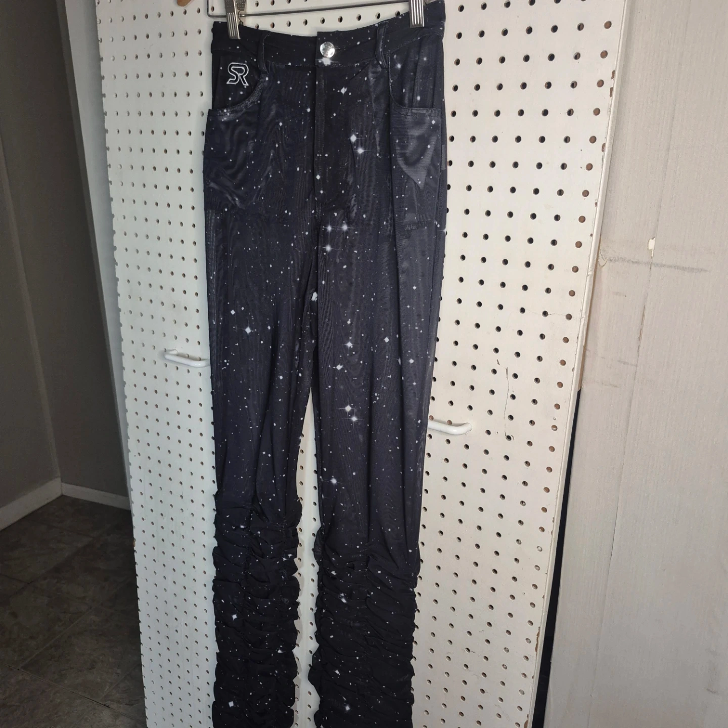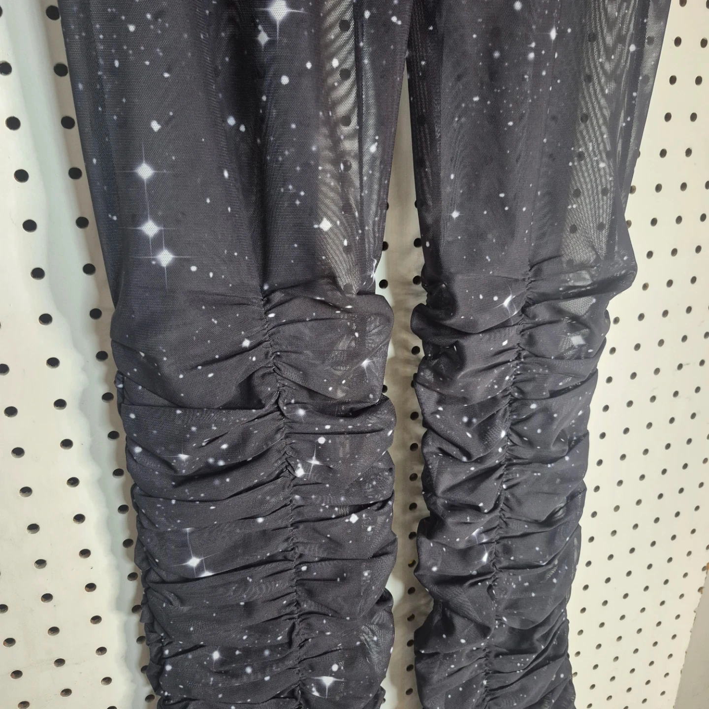 These SO REAL pants feature a unique starry night design and ruched detailing at the bottom! They're perfect for adding a touch of whimsy to your wardrobe. The material is comfortable and stylish, great for everyday wear!