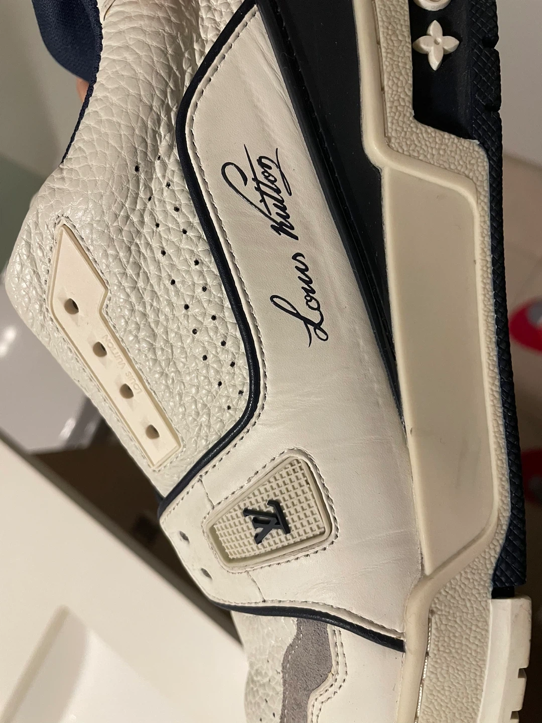 Louis Vuitton sneakers in size 9. The sneakers are made in Italy and feature white leather with navy blue accents.