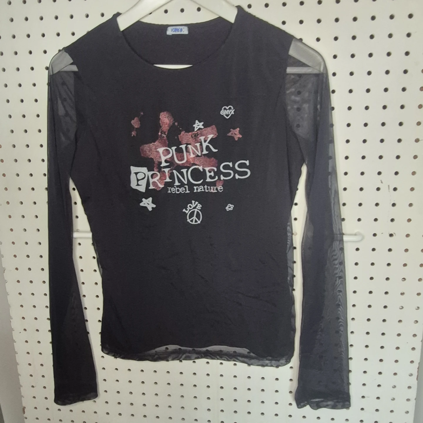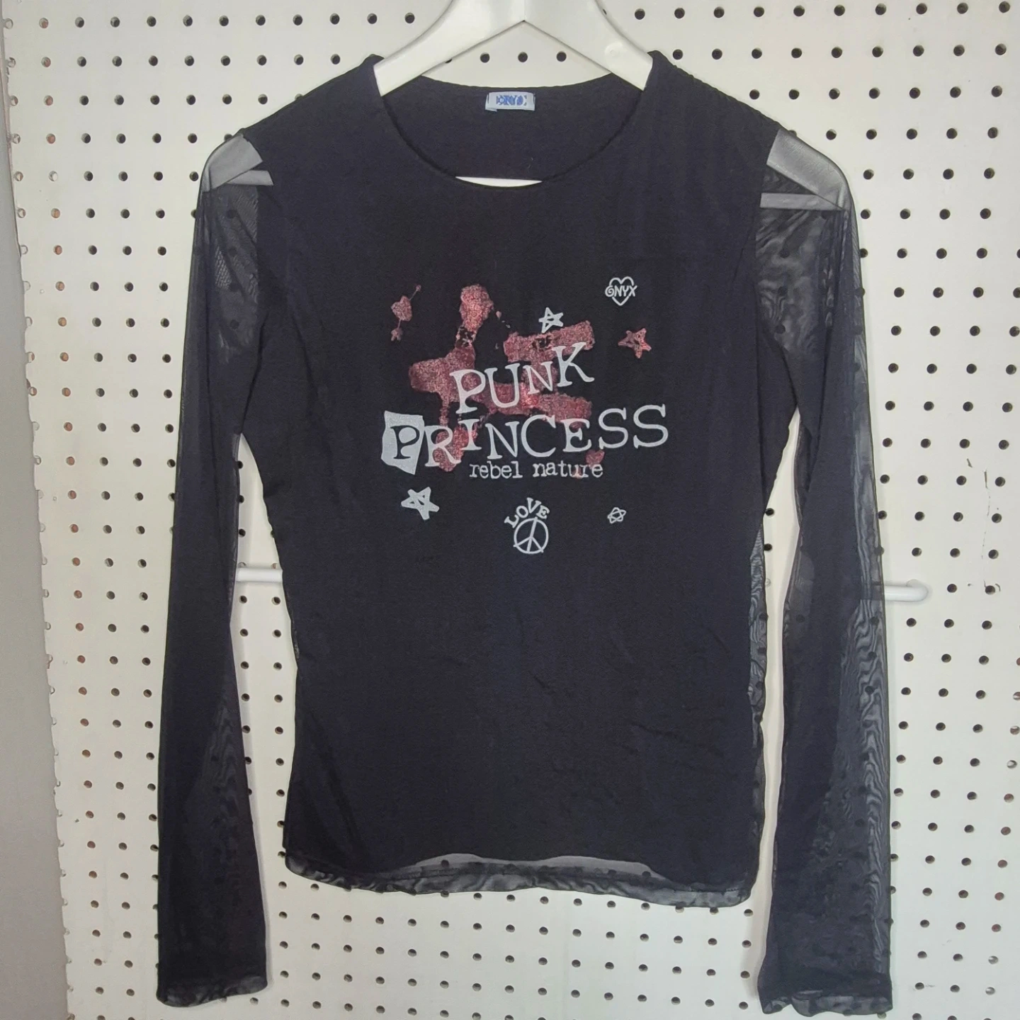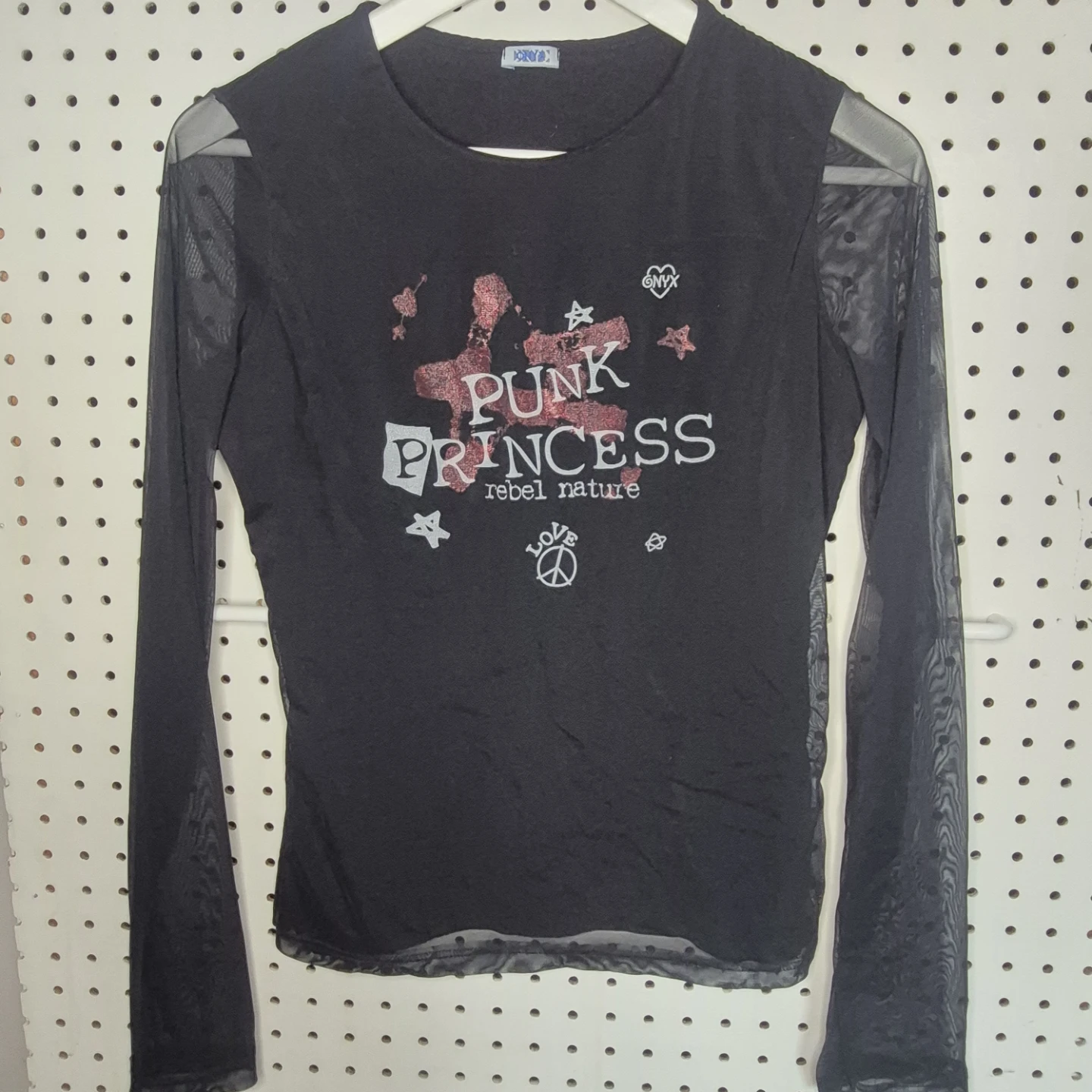 Cute long sleeve top from ONYX featuring a 'Punk Princess' design! It has mesh sleeves and a comfortable fit, perfect for adding a bit of edge to your wardrobe
