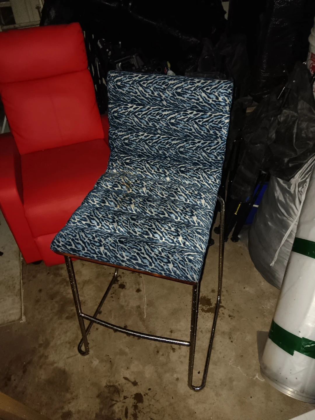 Selling a bar stool with a blue and white patterned upholstered seat and back. It has a sturdy chrome frame. The stool is in good condition and would be great for a kitchen counter or bar area