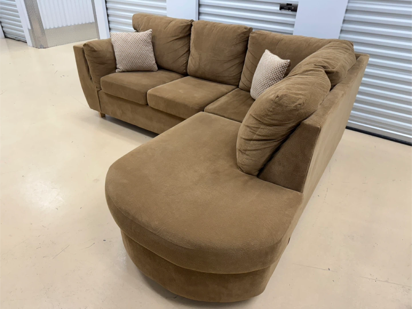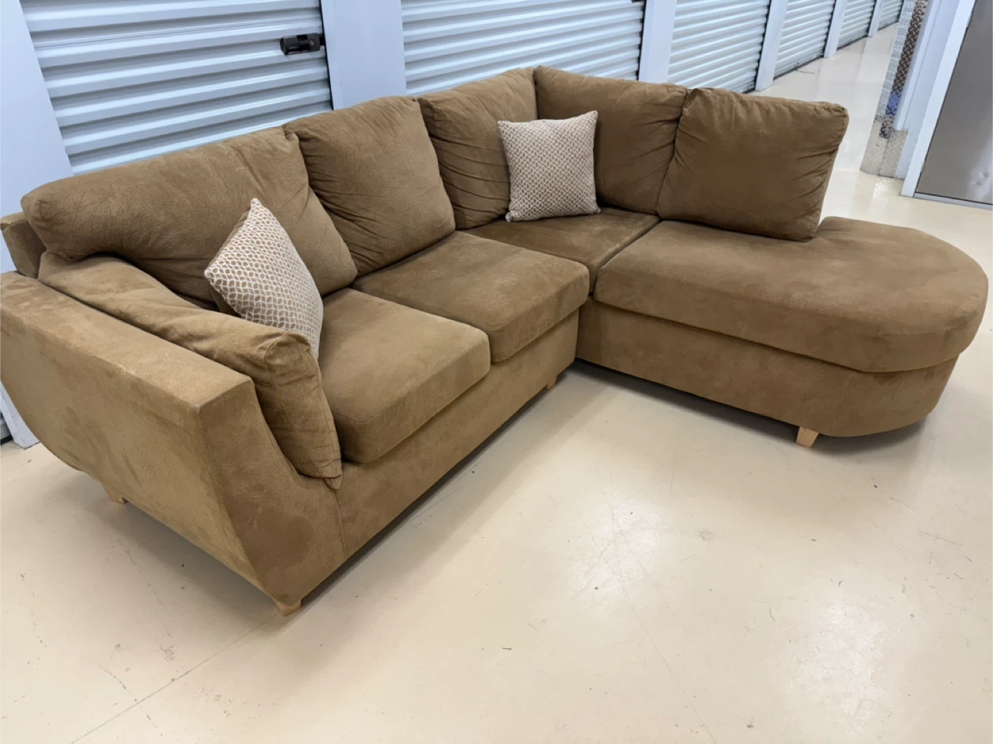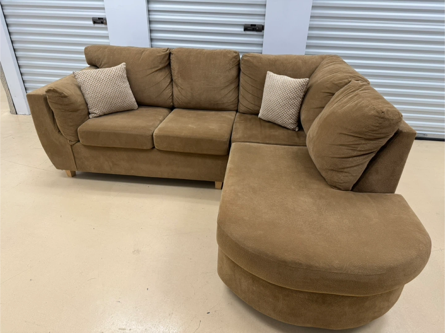 Selling a comfy brown sectional sofa with a chaise lounge! It's in good condition and would be a great addition to any living room. The cushions are soft and the chaise is perfect for relaxing. Ready for a new home! Home delivery available