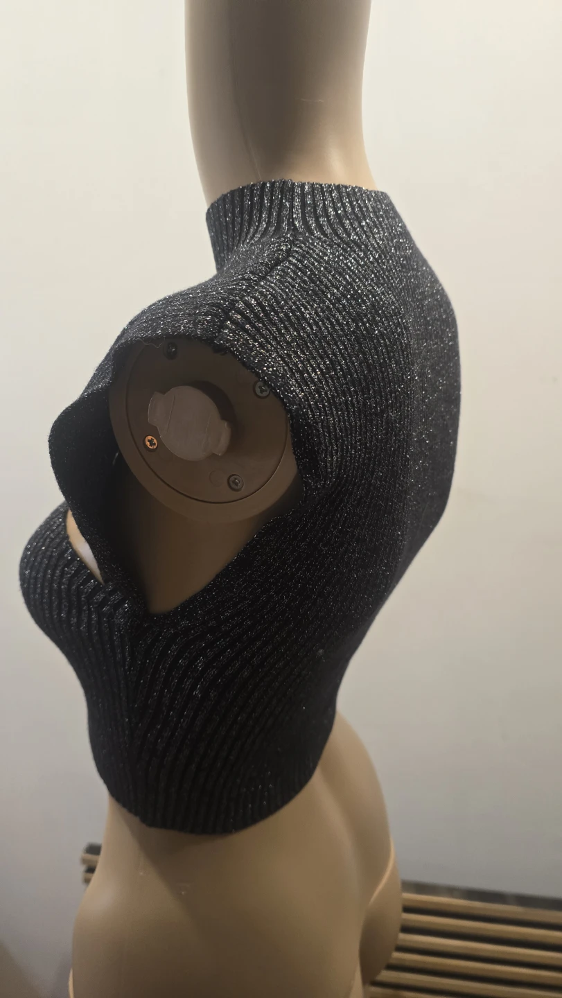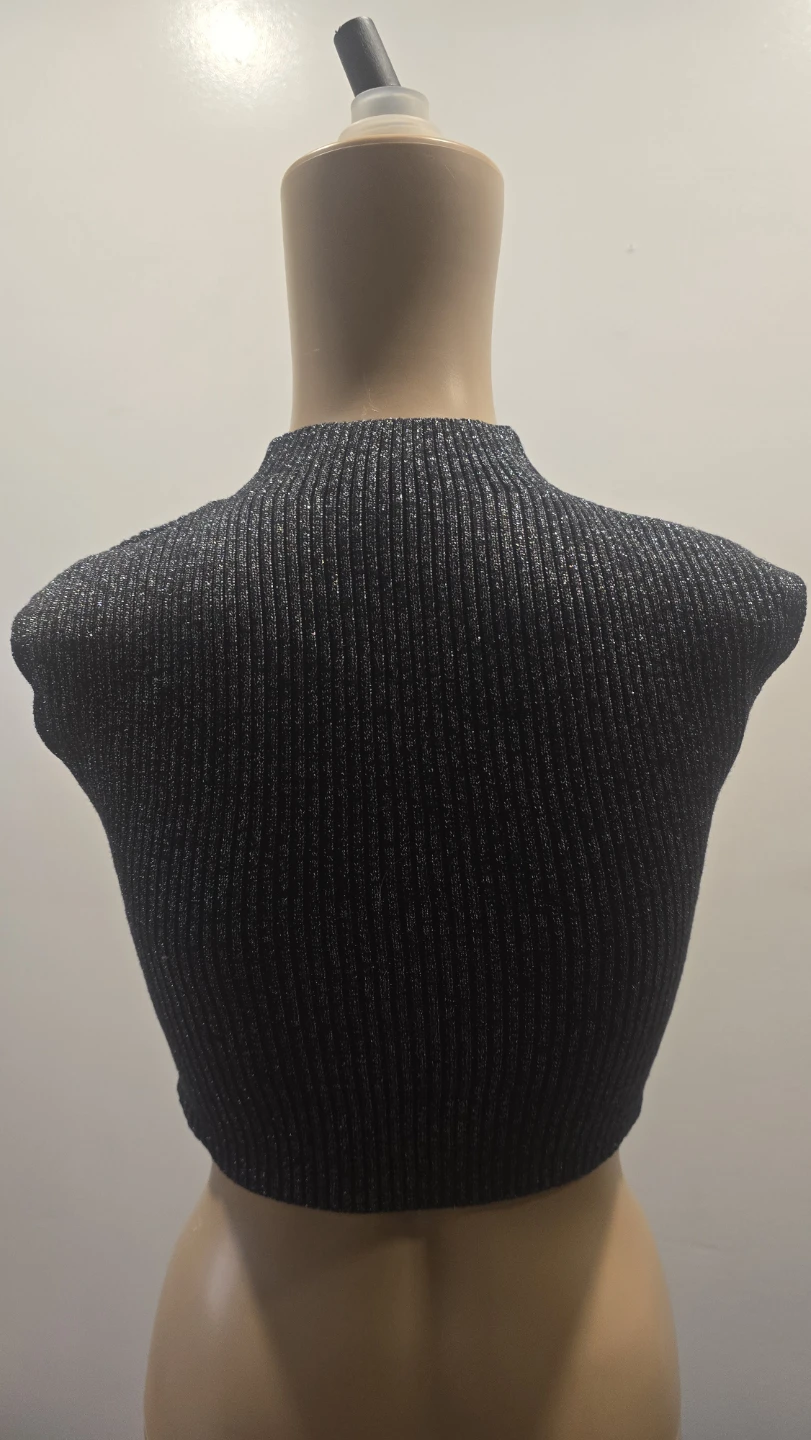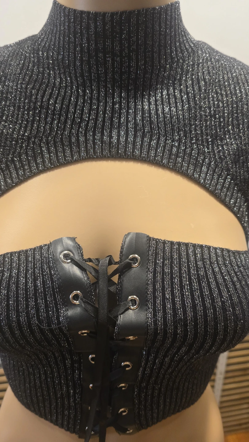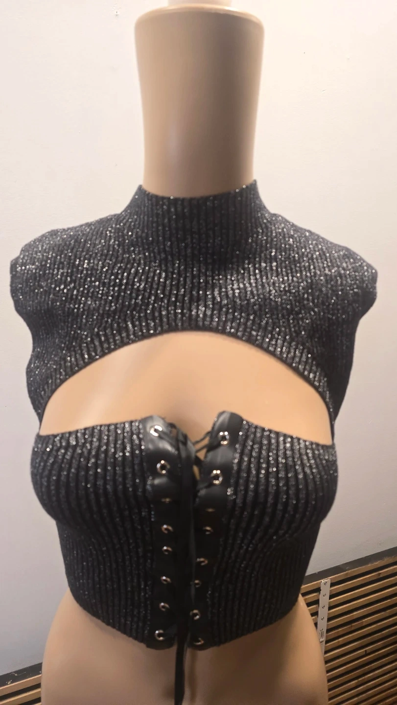 black ribbed knit corset crop top with shimmeing silver. It's a stylish piece that can be dressed up or down. It features a unique design with a corset-style cut-out front and a cropped length. Perfect for adding a bit of edge to your look !