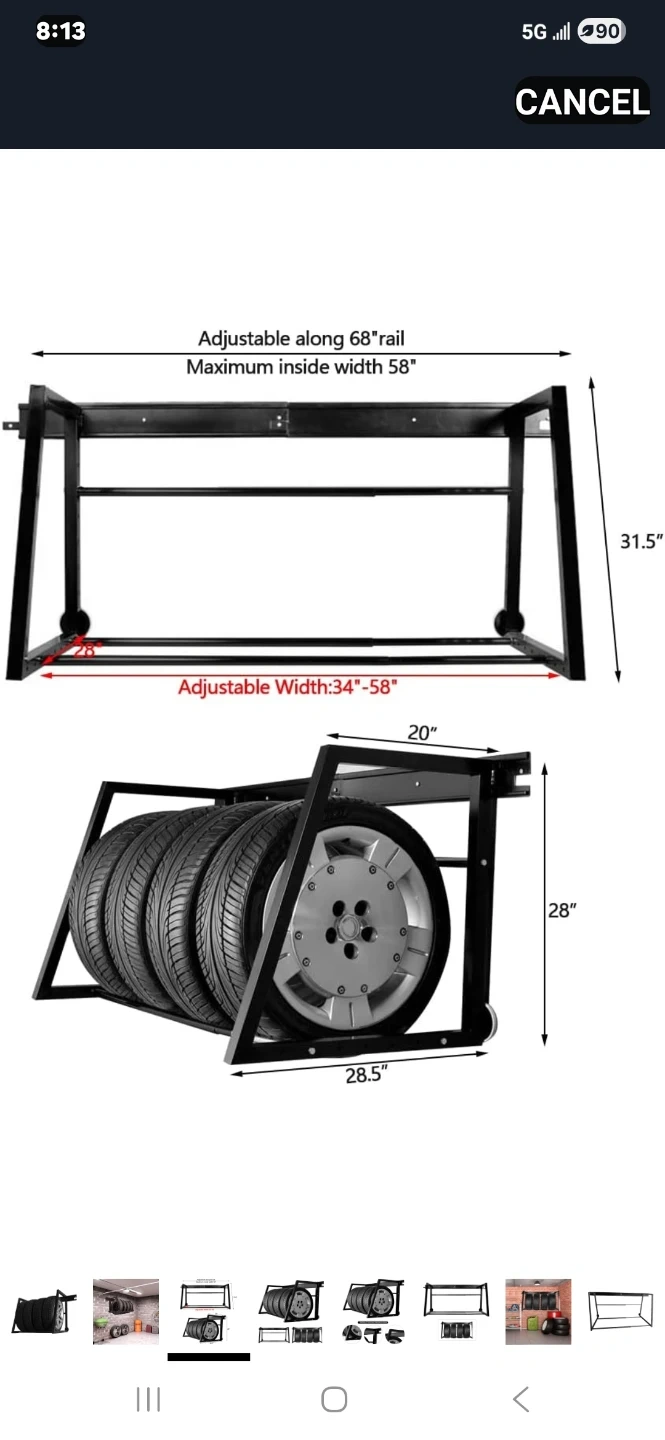 Keep your tires organized with this adjustable tire rack! It can hold up to 4 tires and has an adjustable width from 34" to 58". The rack is adjustable along a 68" rail, with a maximum inside width of 58". Its dimensions are 31.5" in height and 28.5" in depth