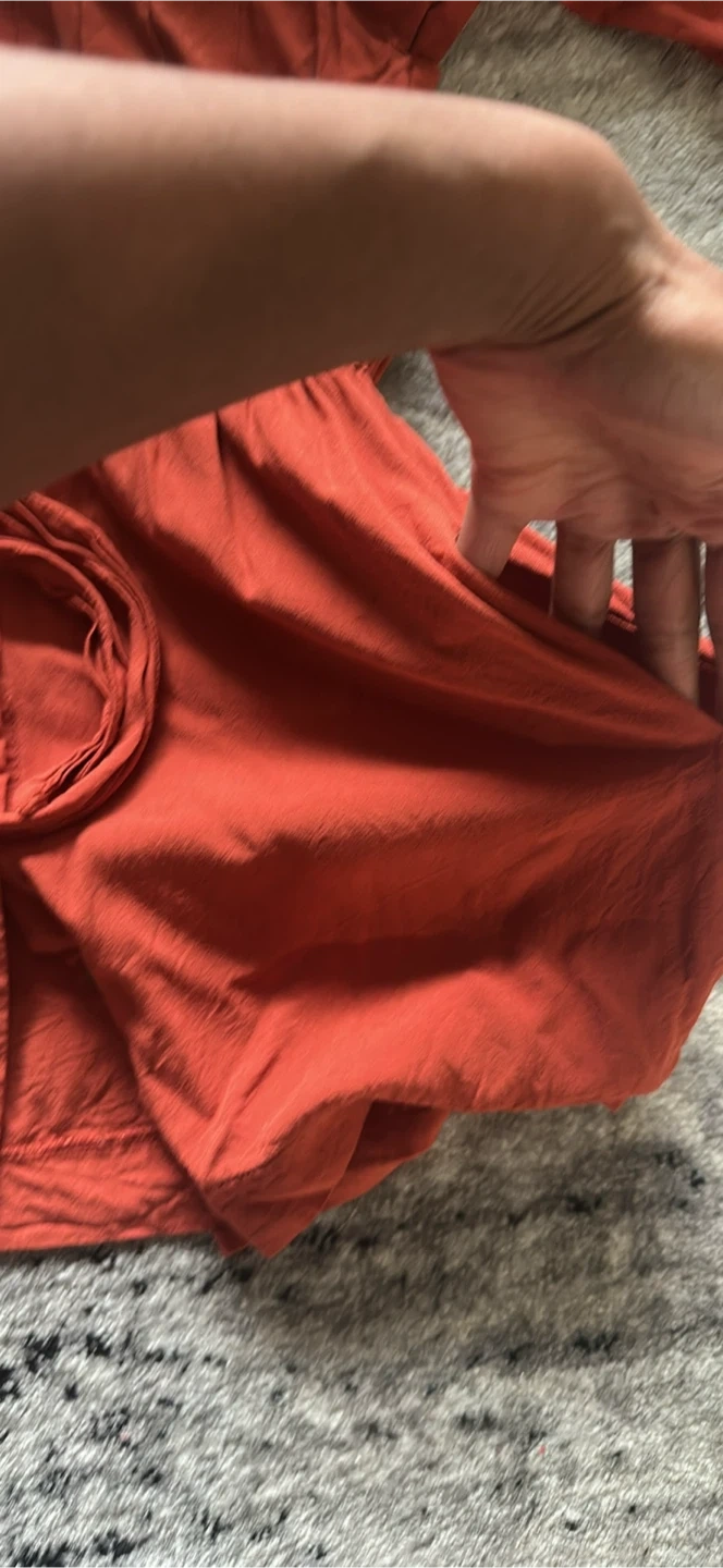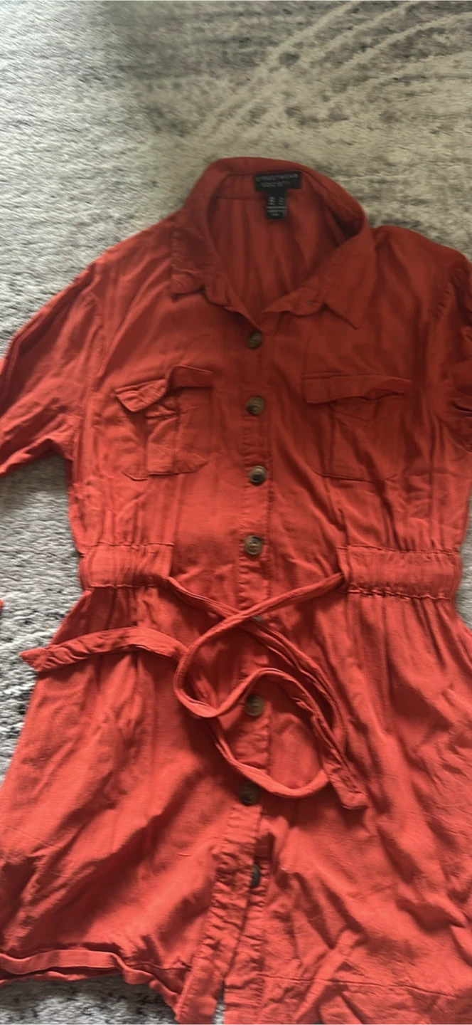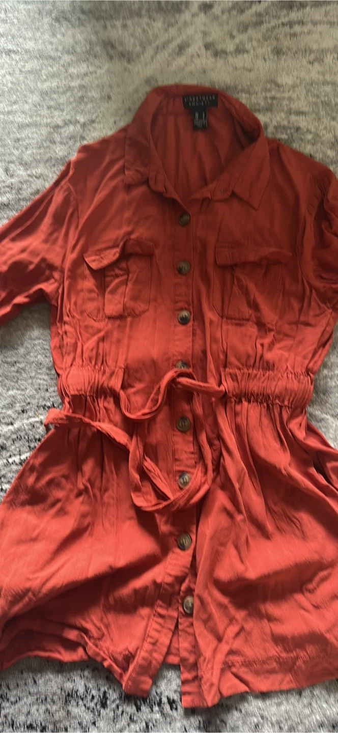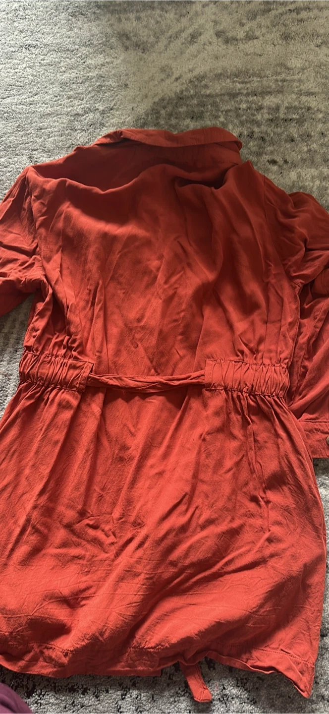 This is a cute orange shirt from Warehouse One in size medium! It features a button-up front, a tie at the waist, and two pockets. Perfect for a casual day out