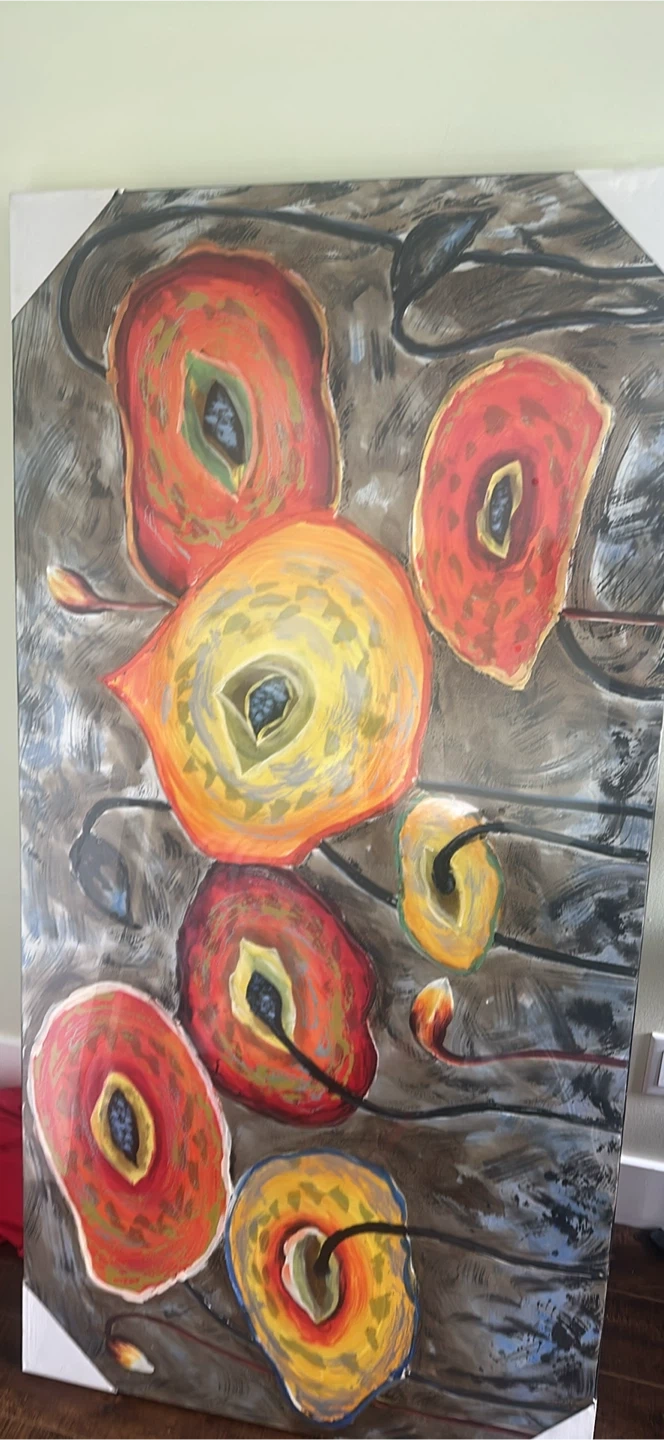 Here's a lovely floral canvas wall art piece! It's perfect for adding a pop of colour and a touch of nature to any room in your home. The canvas features a vibrant floral design with a mix of red, orange, and yellow hues on a neutral background. It's in great condition and ready to hang!