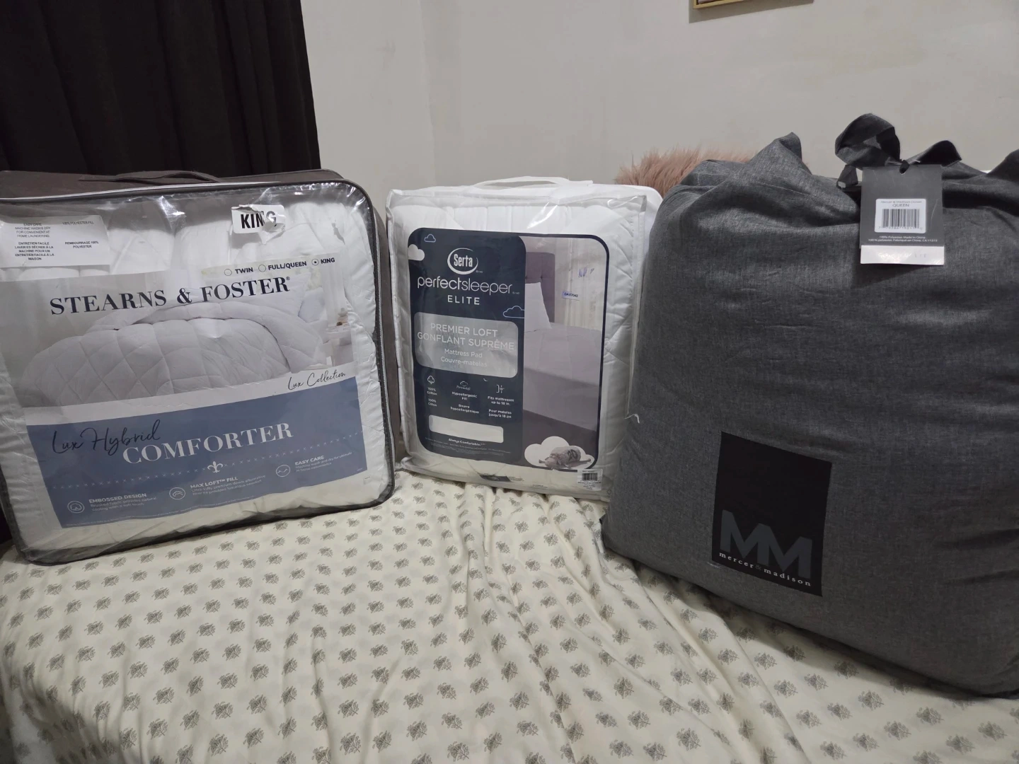 I have a Stearns & Foster Lux Hybrid Comforter for a King size bed available. It's from the Lux Collection and is still in its original packaging. Also included are a Serta Perfect Sleeper Elite mattress pad and a Mercer & Madison bag