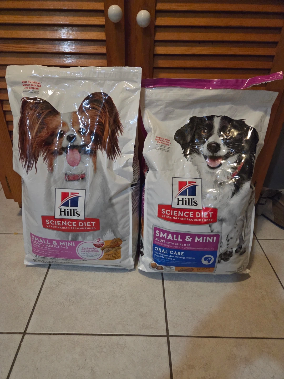Selling two bags of Hill's Science Diet dog food for small and mini breeds. One is for light/adult 1-6, and the other is for oral care. Both are veterinarian recommended for adult dogs up to 25 lbs/11 kg