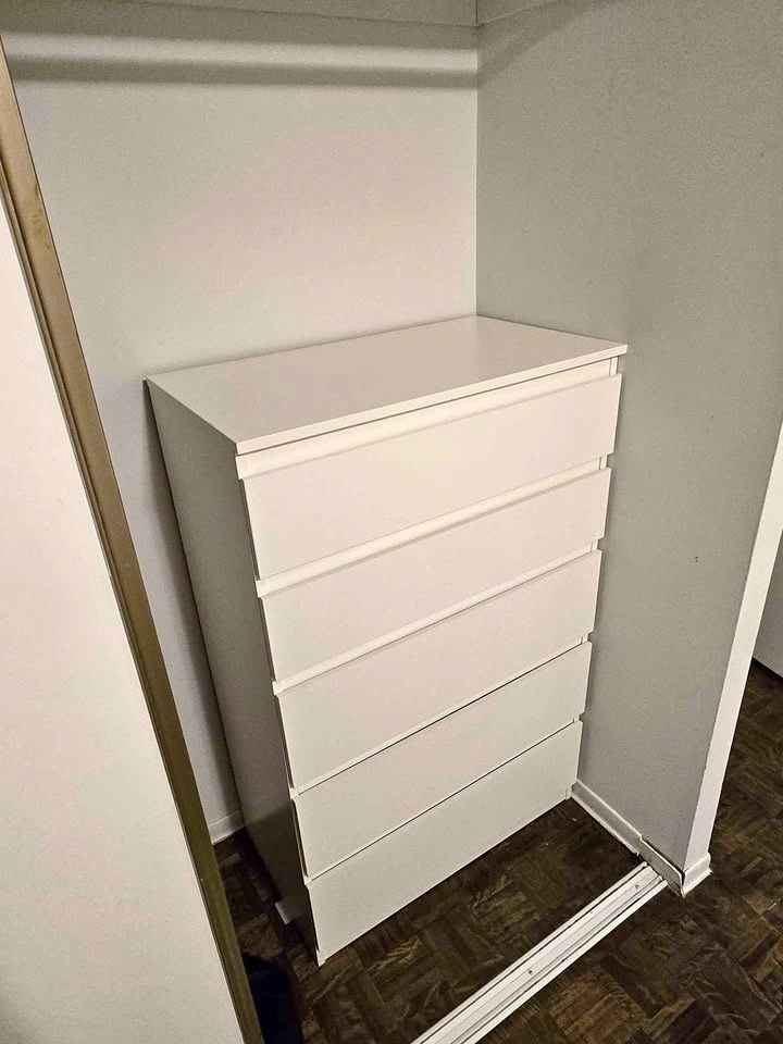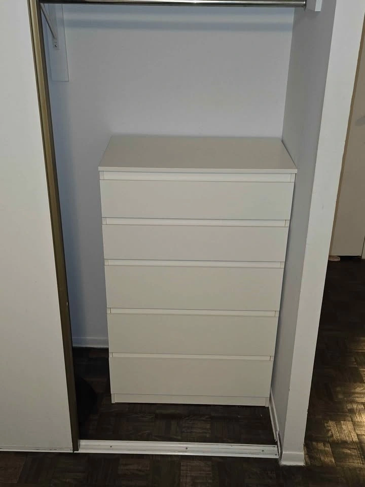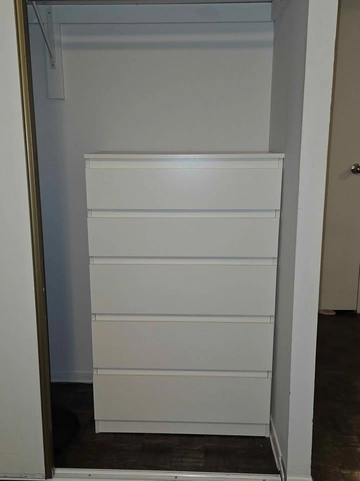 White IKEA chest of drawers with 5 drawers. Clean, modern design, perfect for bedroom, closet, or hallway storage. Drawers slide smoothly, very sturdy and functional.