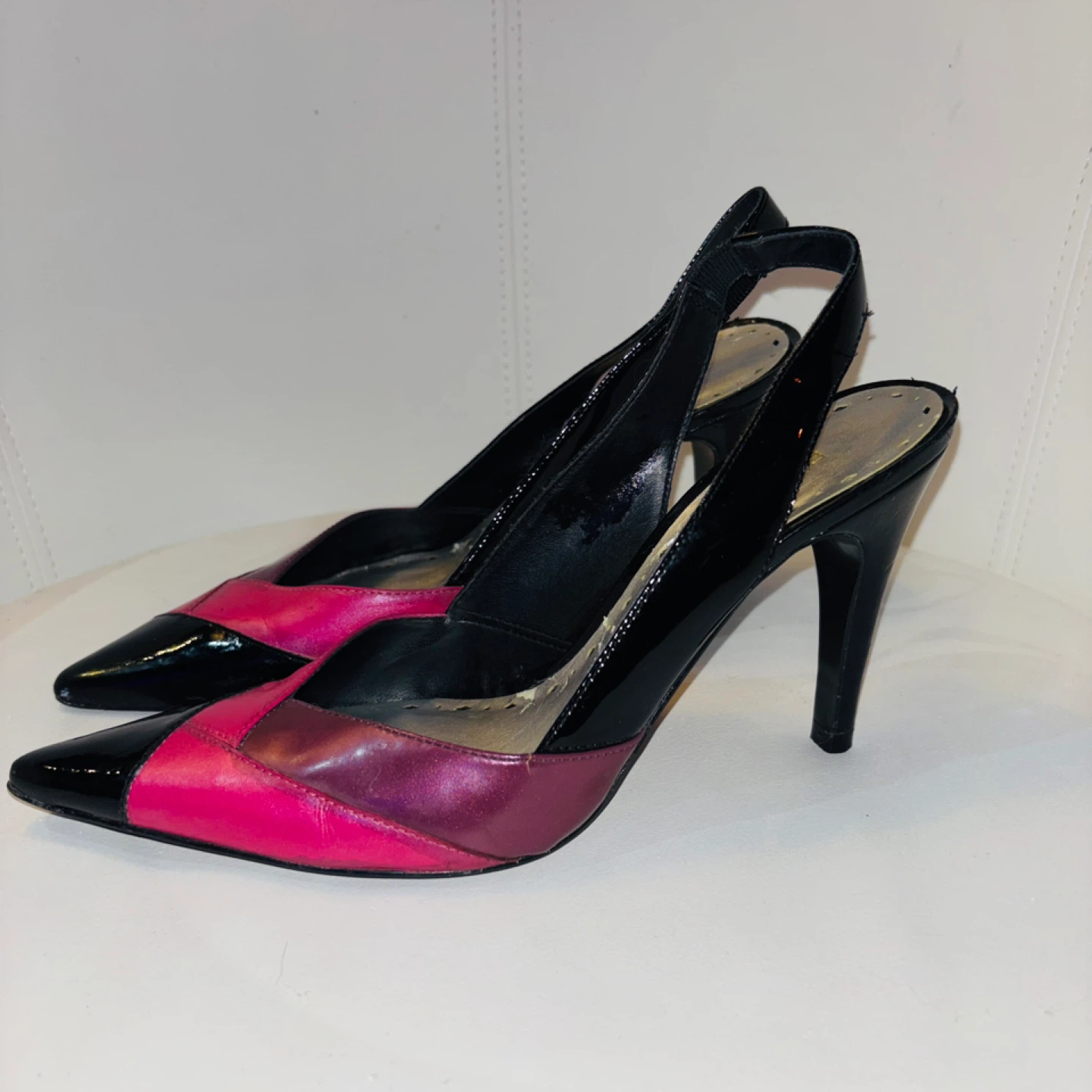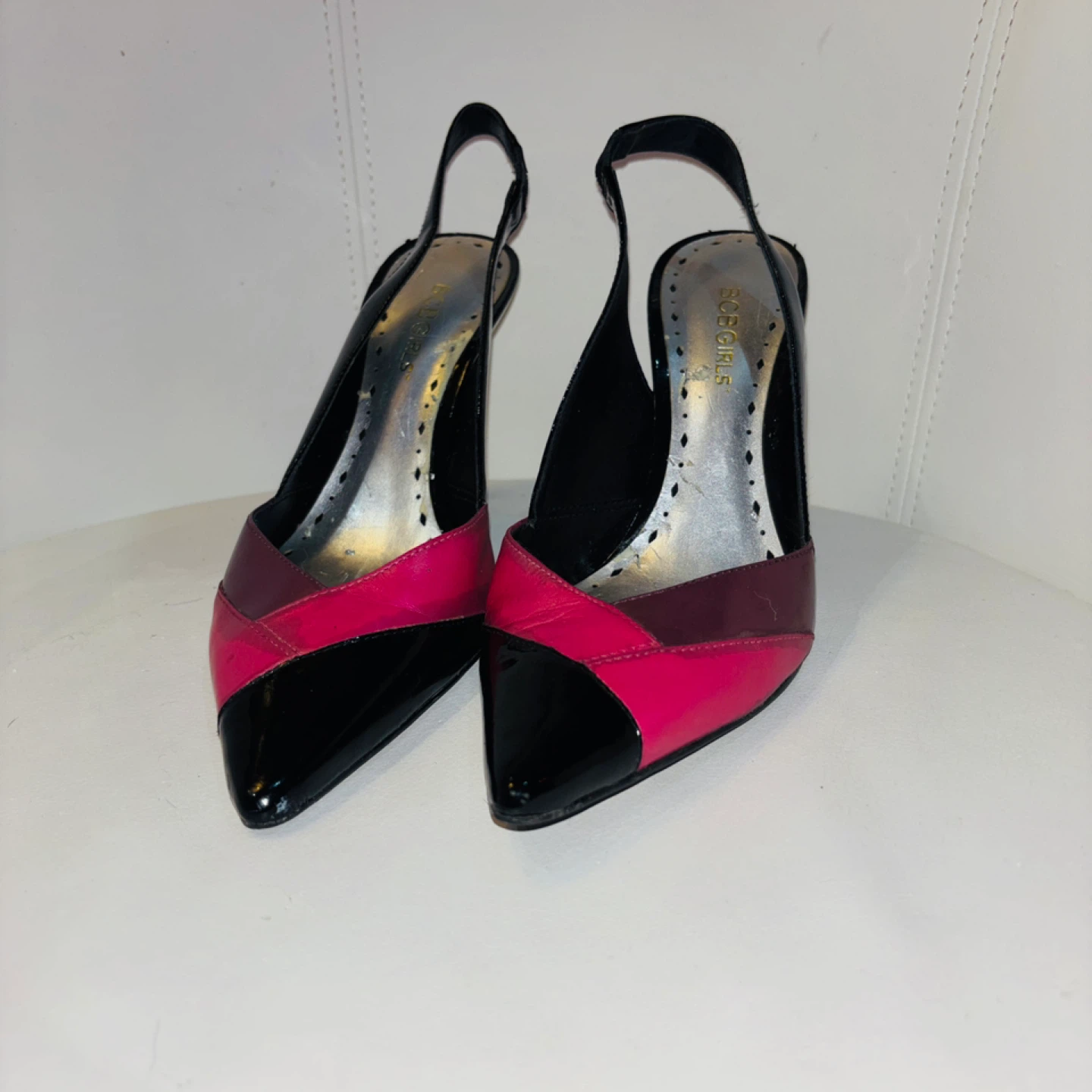 Selling a pair of BCBGirls slingback heels in size 7. These heels feature a stylish design with black and pink patent leather accents. Perfect for adding a pop of colour to your outfit!