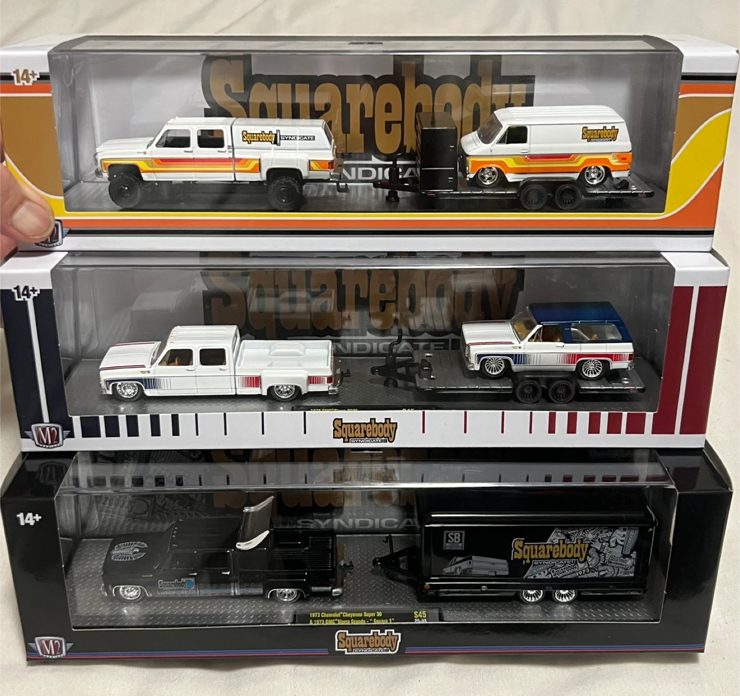 Selling a set of M2 Squarebody Syndicate diecast cars. These are perfect for collectors! The set includes a variety of trucks and trailers, all in their original packaging. Each box is marked for ages 14+