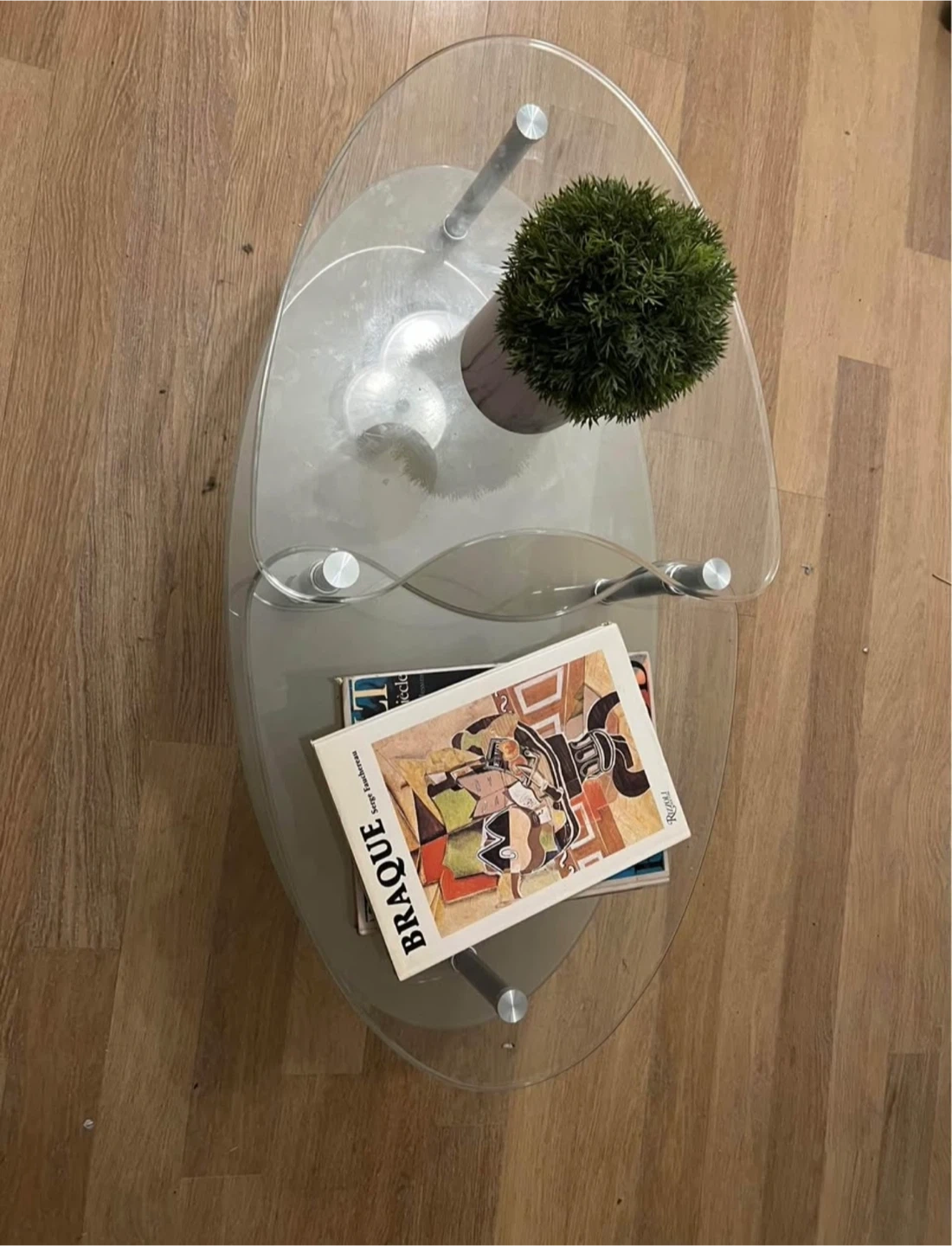 Selling a stylish glass coffee table, perfect for adding a modern touch to your living room! It features a two-tier design, providing ample space for magazines, decor, or your favourite coffee table books. The sleek glass and chrome finish will complement any decor