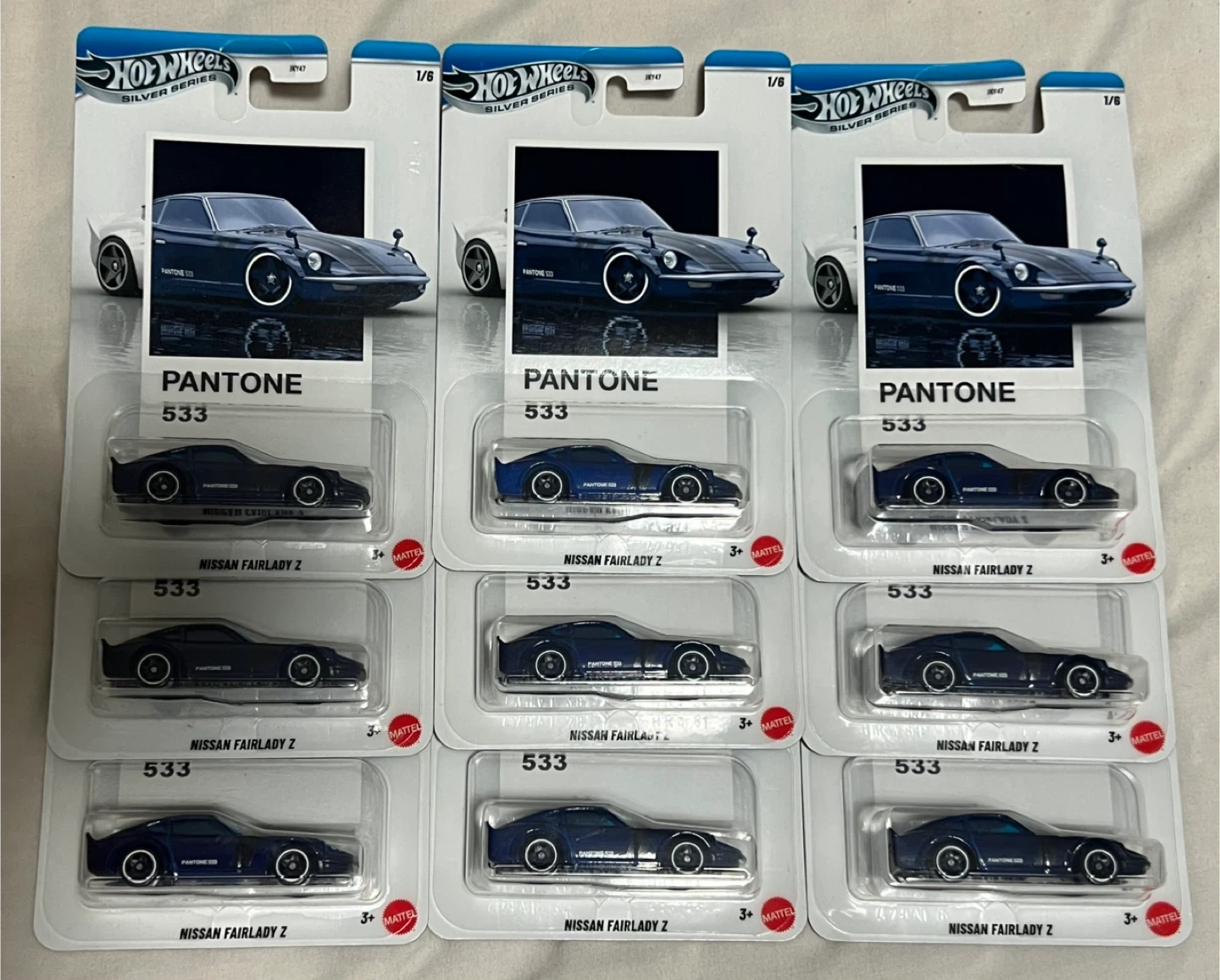 Selling a collection of Hot Wheels Silver Series Nissan Fairlady Z cars in Pantone 533! These are new in their original packaging, perfect for collectors or anyone who loves cool toy cars