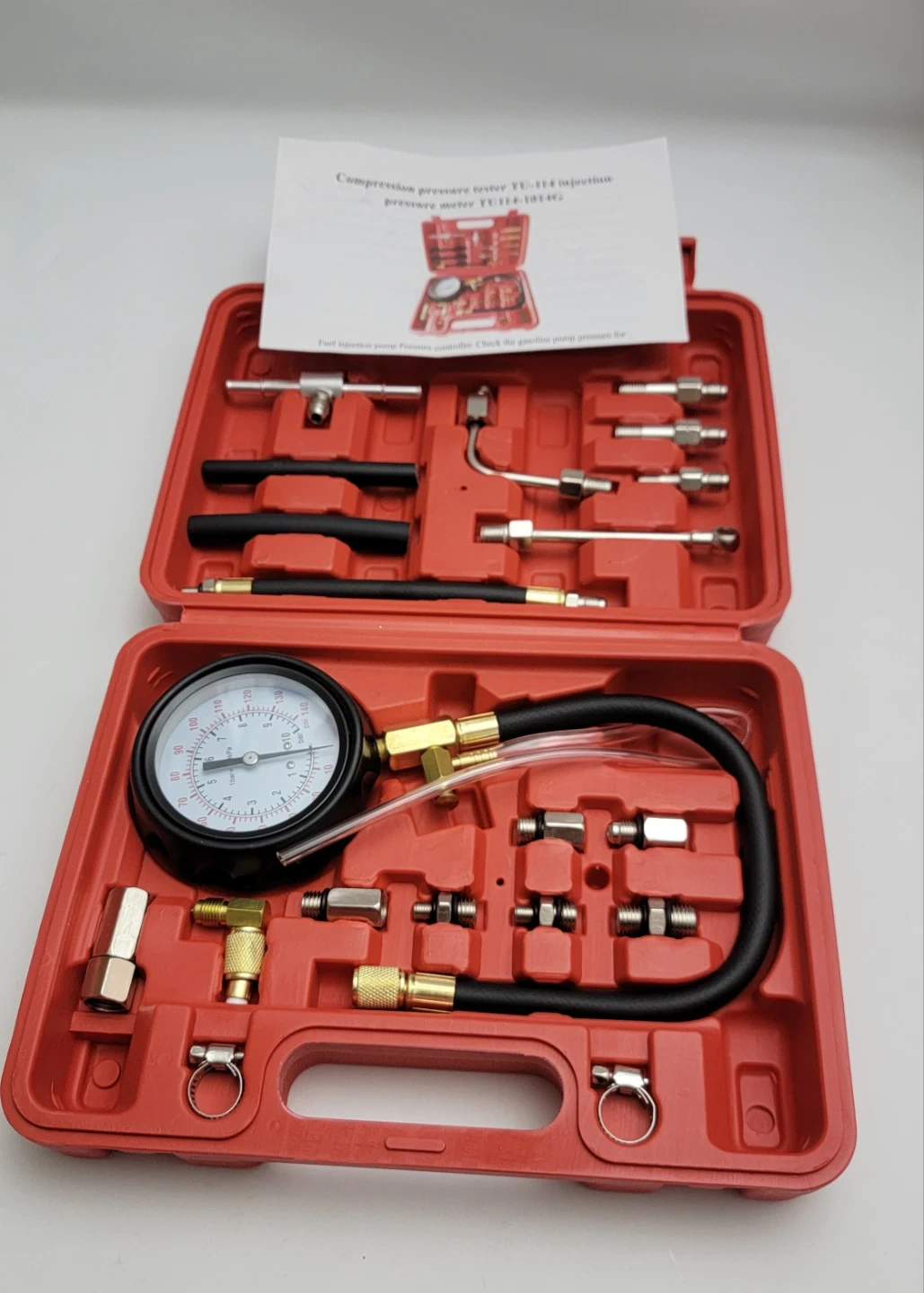 This universal kit includes multiple adapters and hoses to fit a wide range of gasoline engines — perfect for DIY mechanics and professional use.