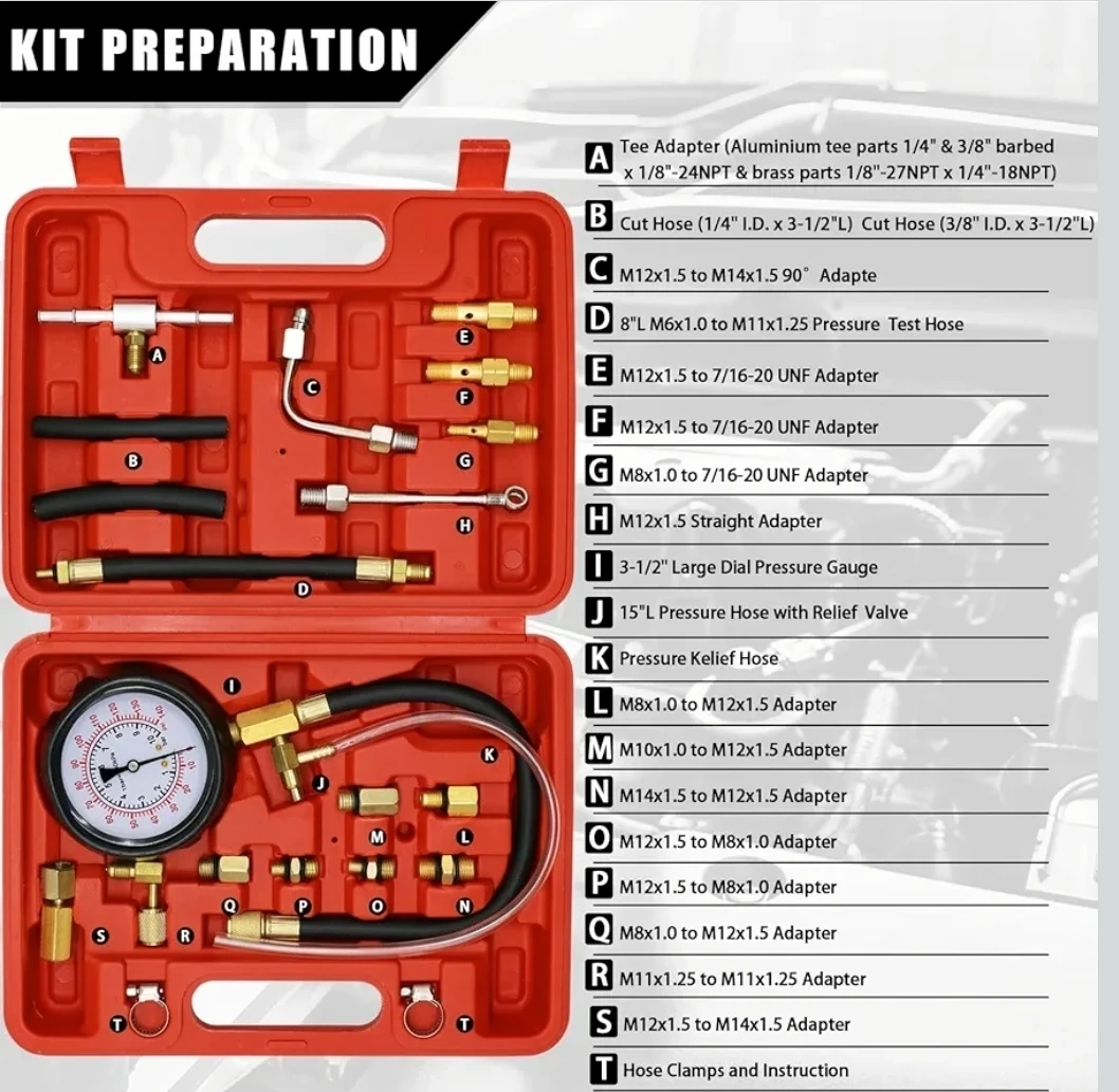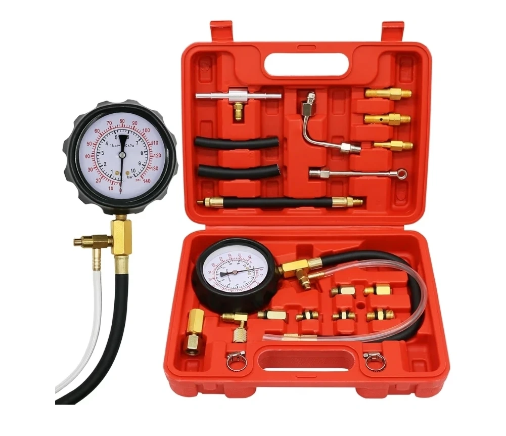 A comprehensive fuel system pressure testing kit designed for gasoline engines. Helps determine if fuel delivery, injectors, or pressure regulators are functioning properly.