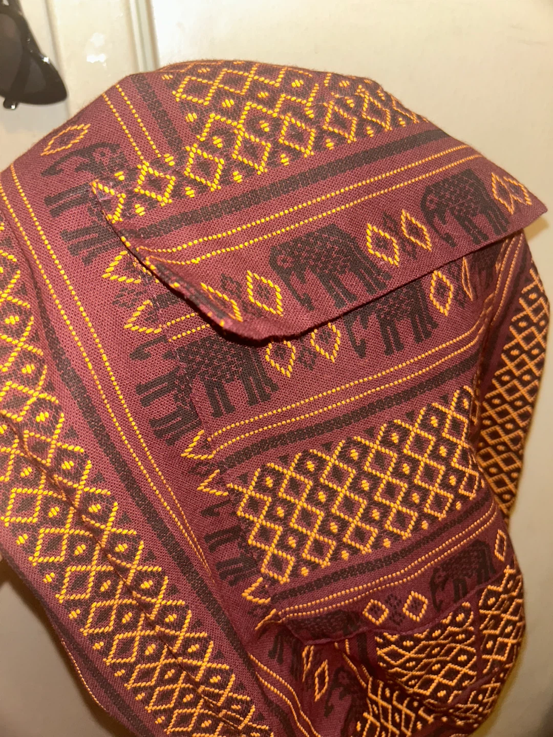 Maroon/warm brown coloured, featuring golden accents and dark elephant patterns.