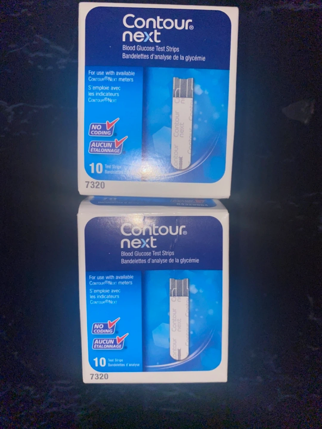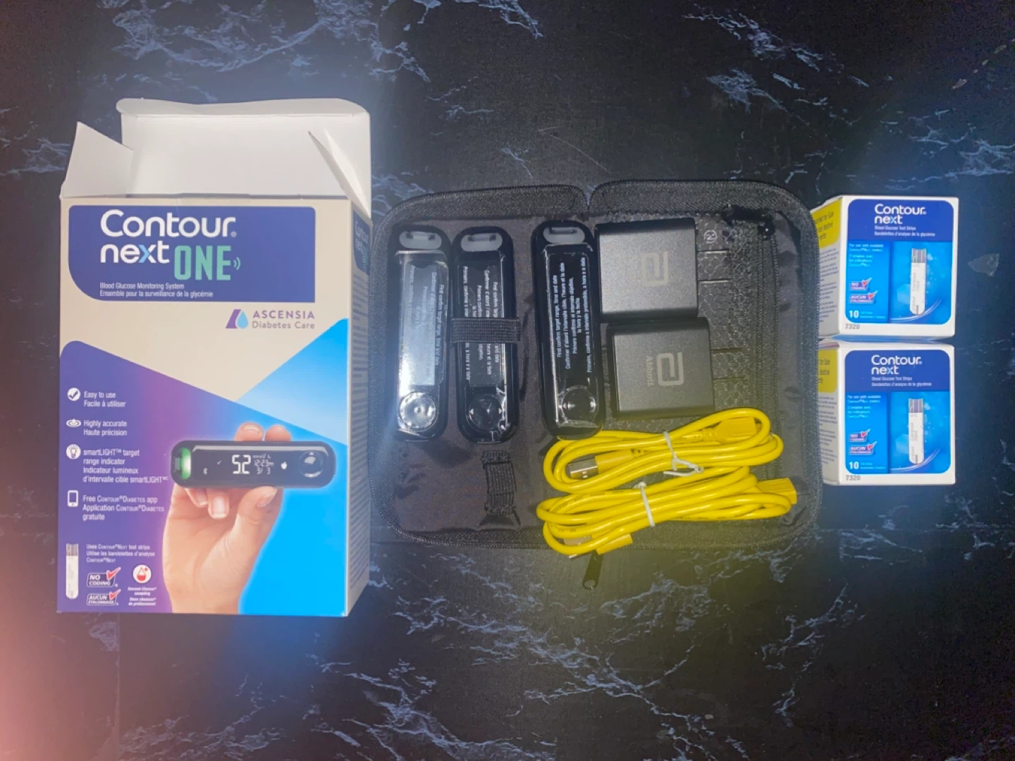 Contour Next One blood glucose monitoring system. Easy to use and provides highly accurate results. It features smartLIGHT target range indicator and is compatible with the free Contour Diabetes app. Comes with two boxes of 10 test strips 3 contour One Glucose monitors 2 extra replacements and a convenient carrying case