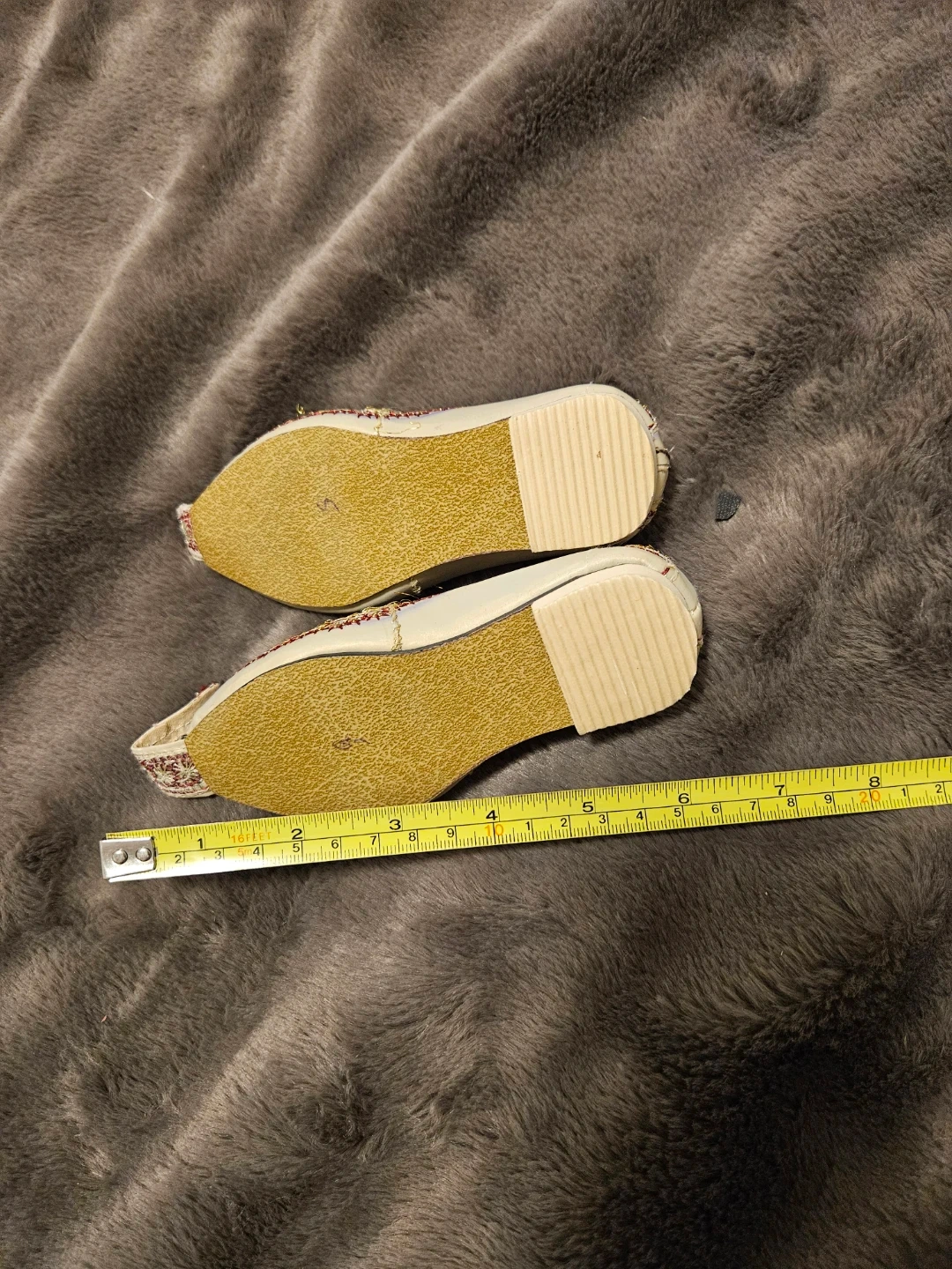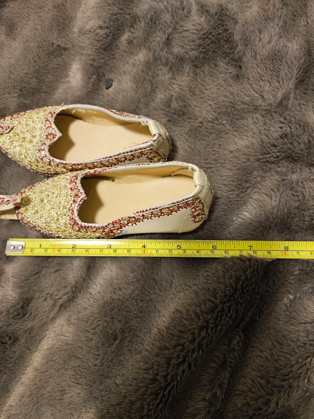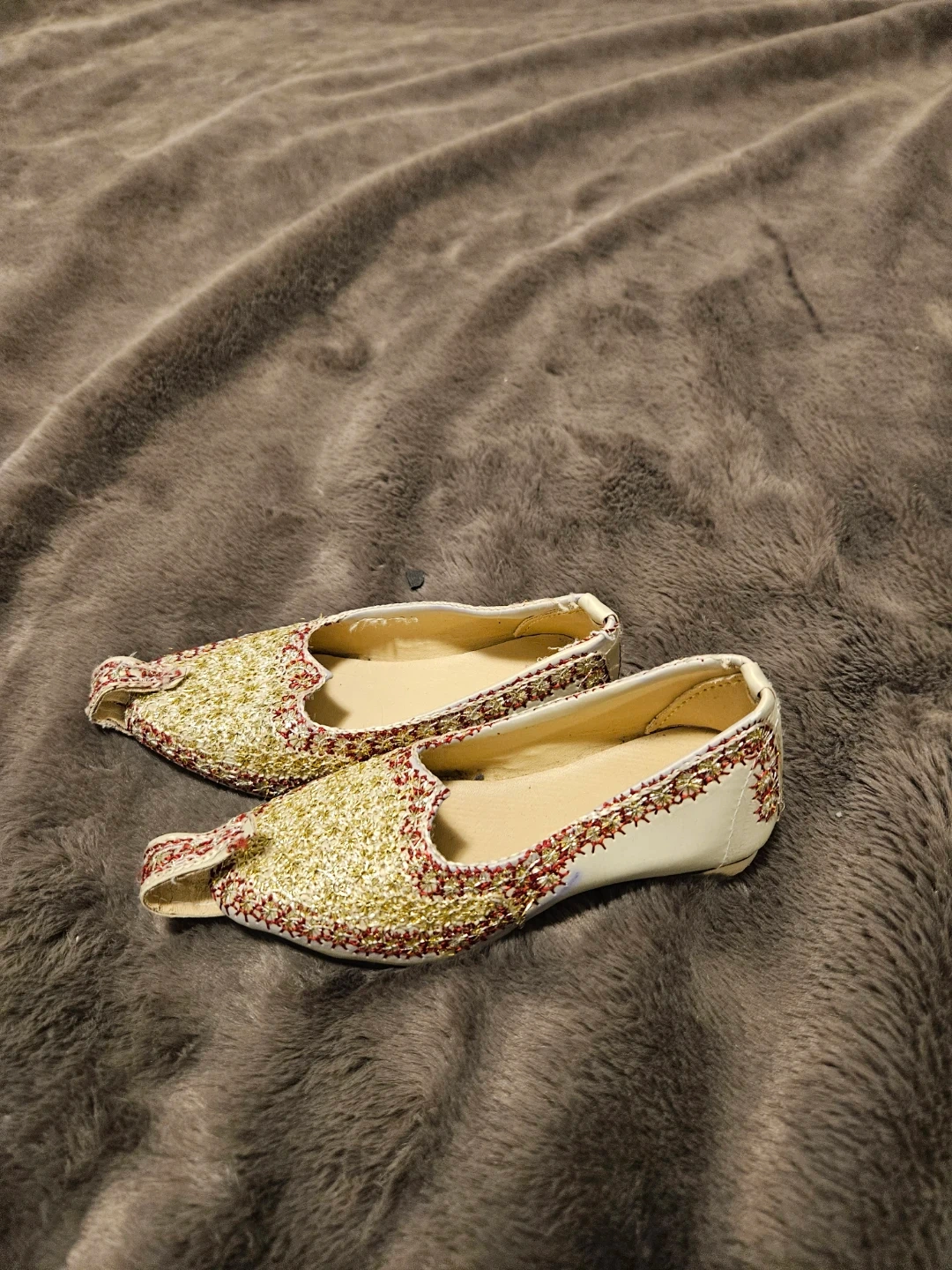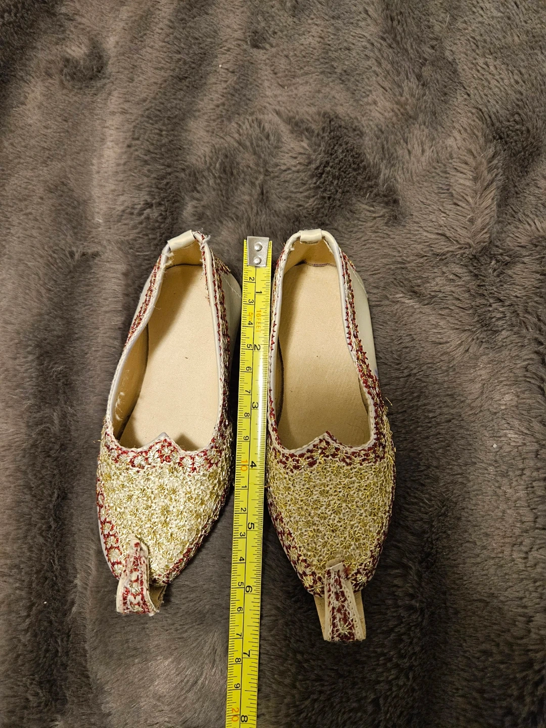 These unique shoes feature beautiful gold and red embellishments! Based on the photos, they appear to be approximately a size 8. Perfect for adding a touch of sparkle to any outfit