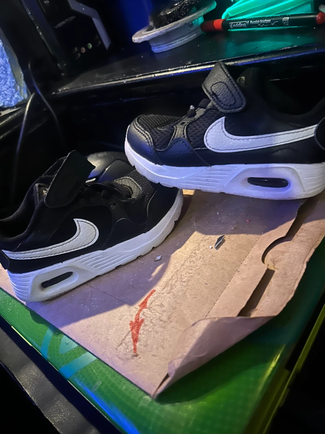 Selling a pair of Nike sneakers in black and white. They feature a velcro strap and the classic Nike swoosh. Great for everyday wear! Size 7c asking 25