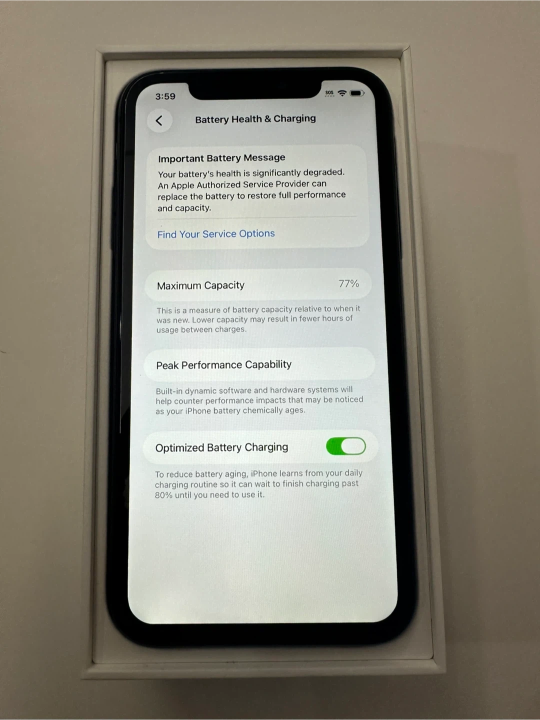 Battery Health = 77%.
