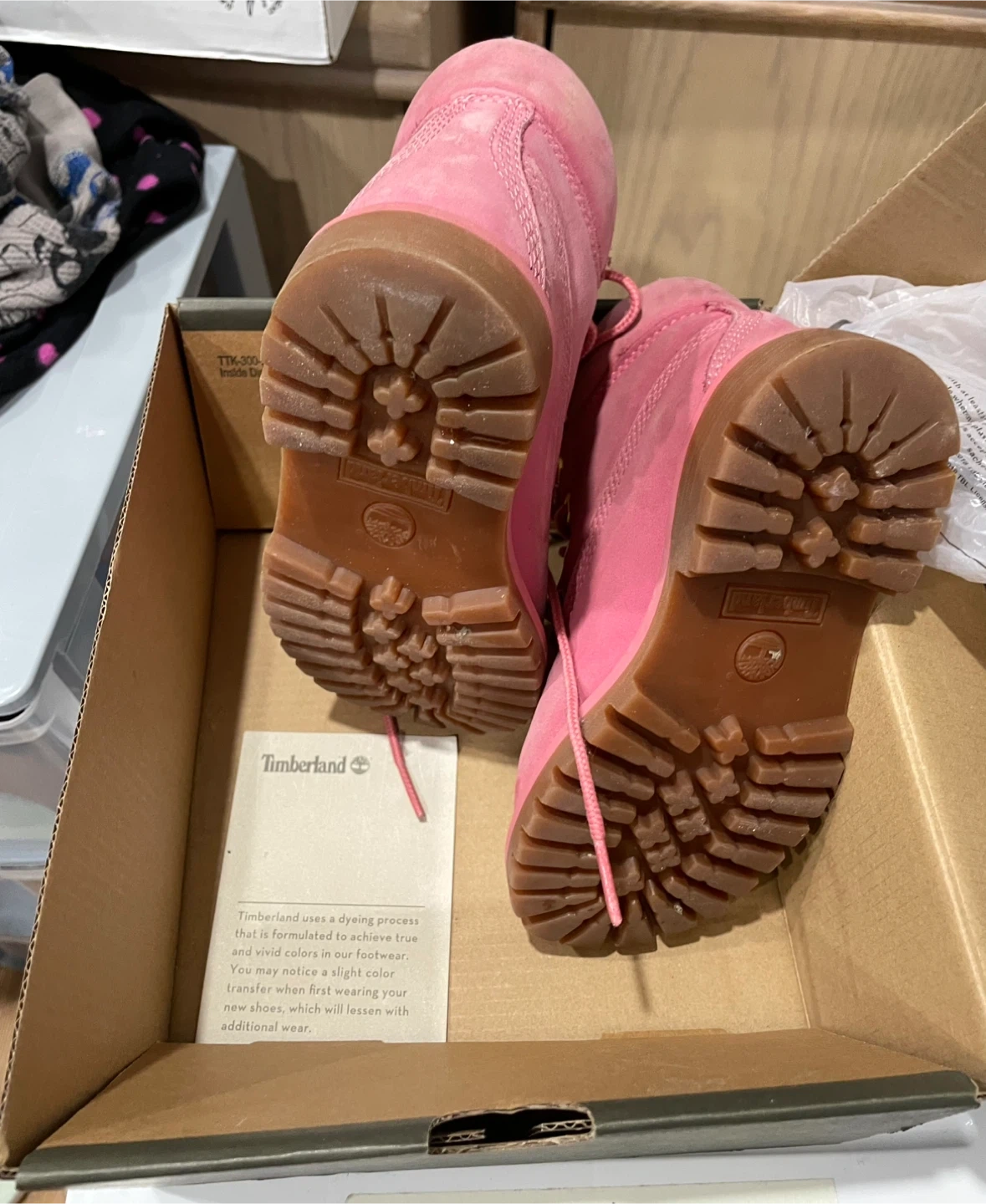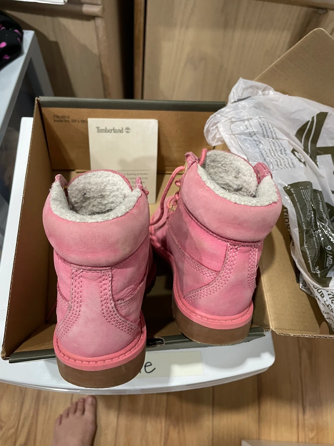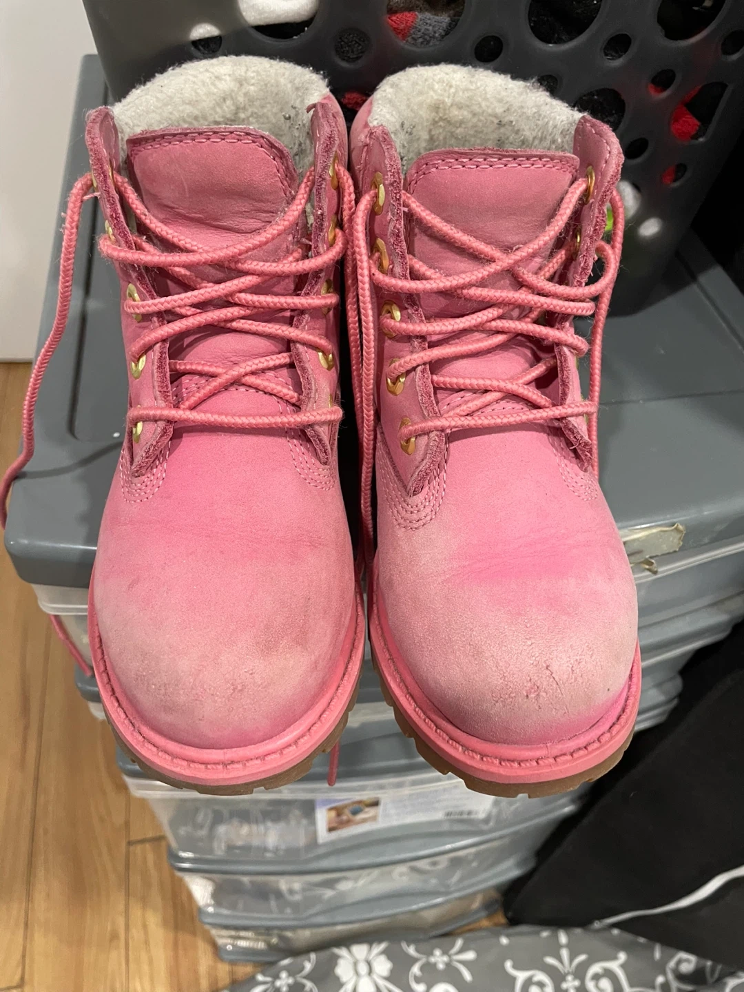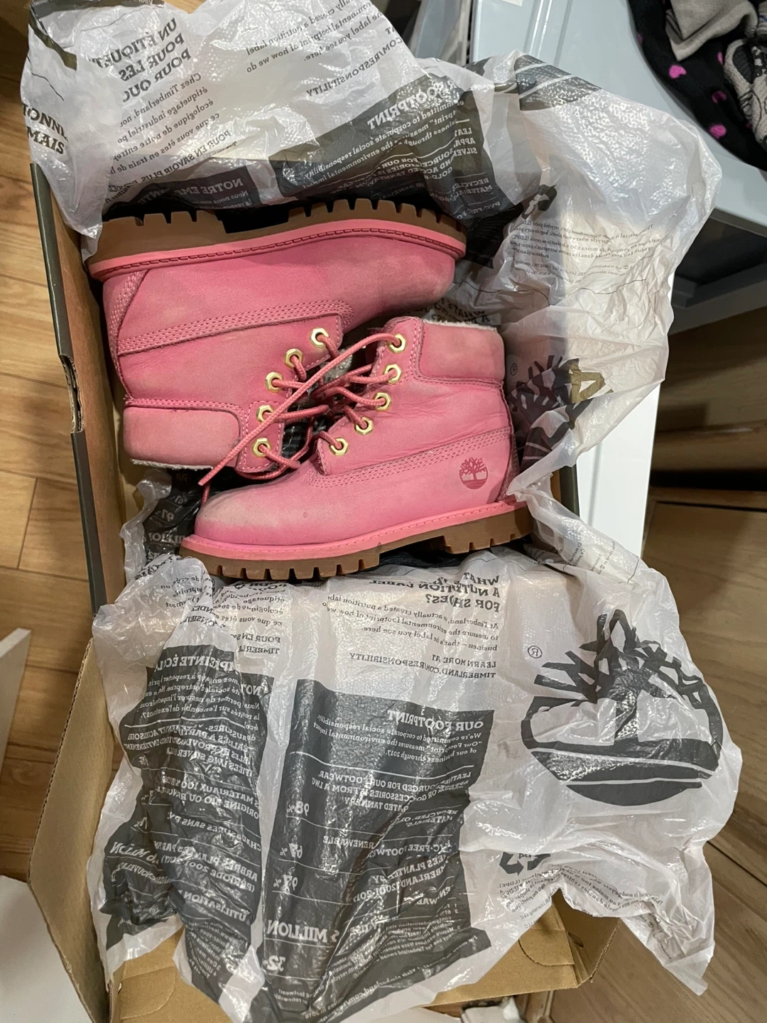 Here's a pair of Timberland Premium 6" Shearling Boots in a lovely medium pink nubuck colour. They are a toddler's size 10. These are waterproof and come with the original box. For a 3-4 year old