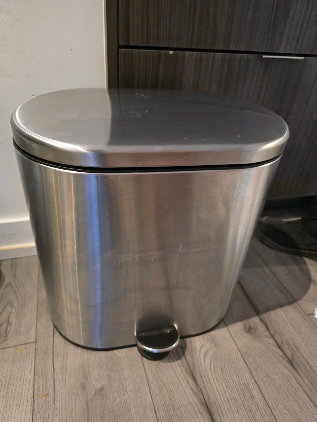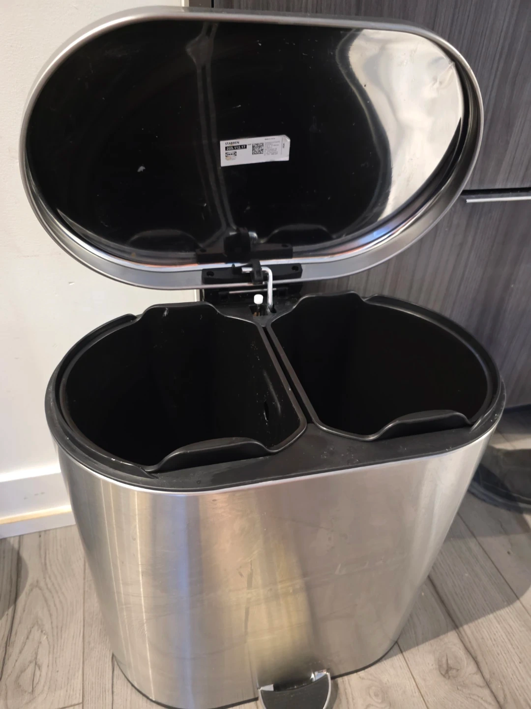 This is a dual compartment trash can, perfect for separating your recycling from your regular waste. It's made of stainless steel, so it's durable and easy to clean! The foot pedal makes it easy to open, even when your hands are full