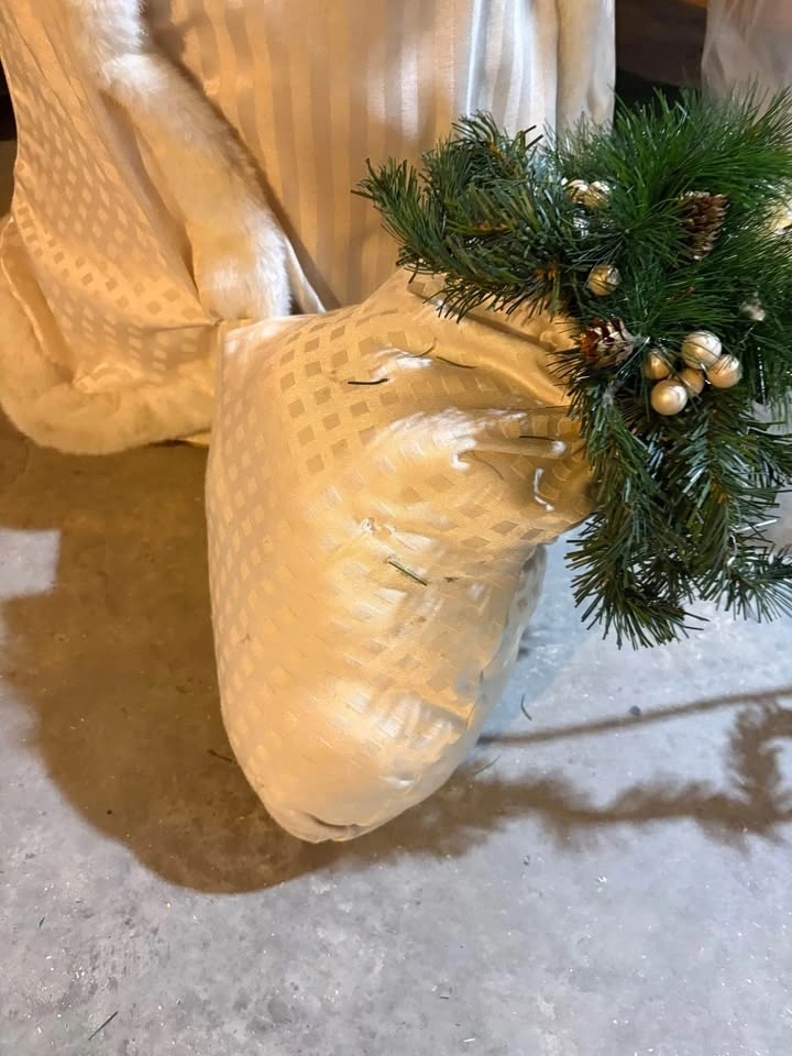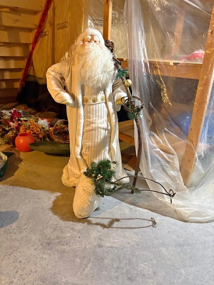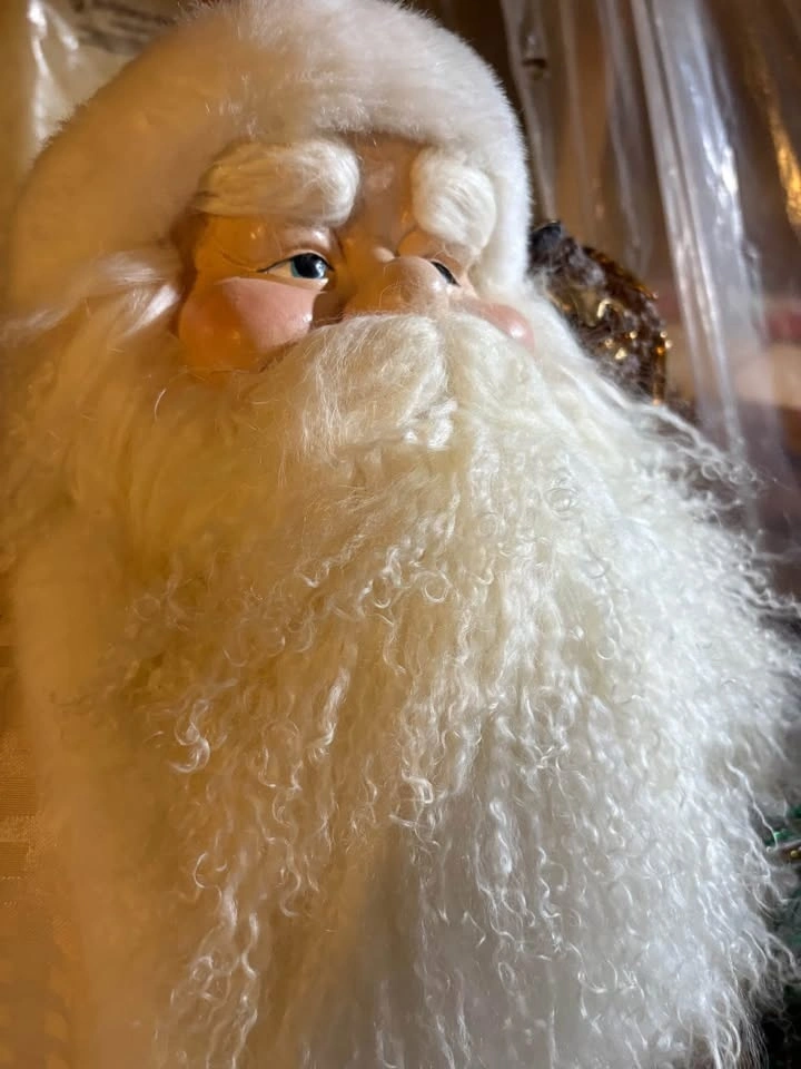Stunning, 4-foot tall (48") standing Santa Claus figure in excellent condition. This is a high-quality, life-size decorative piece featuring a beautiful traditional design. He is dressed in a rich cream suit with faux fur trim and holds classic holiday accessories including a staff and a gift sack.