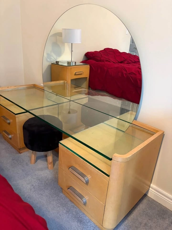 • Vanity/Desk with Massive Round Mirror: Features a glass-protected top and tiered "waterfall" pedestals. Measures 58.5” wide 18” deep 20.5” high, mirror 29” high